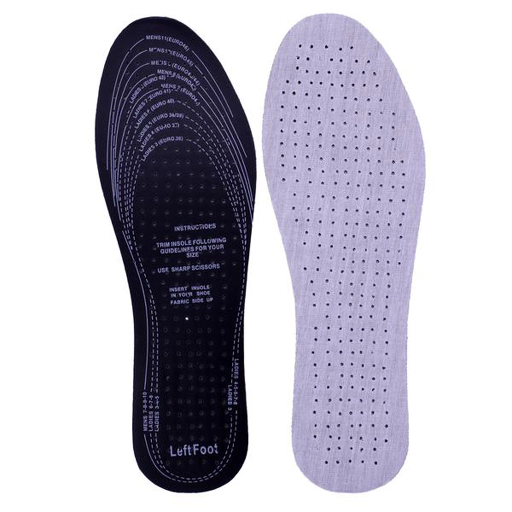 Universelle indlægssåler i en kombination af bomuldsstof og latexskum giver et behageligt skridt, bedre åndbarhed og blød stødabsorbering til hverdagsbrug.
