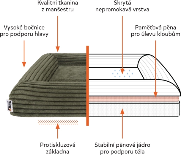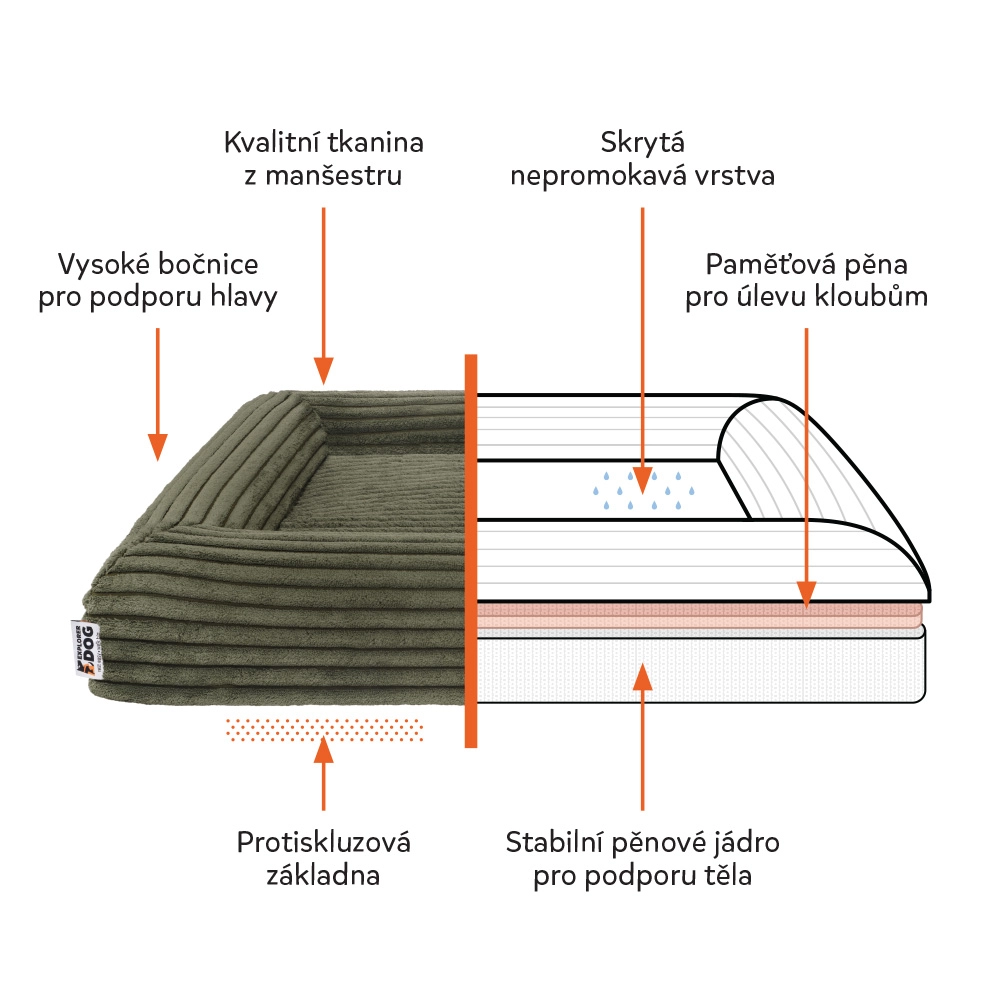 Betrækket i blød manchester (100% polyester) er behageligt at røre ved, tørrer hurtigt og er lugtafvisende. Opfylder OEKO‑TEX Standard 100, skummene er CertiPUR‑US – uden formaldehyd og tungmetaller. Takket være YKK-lynlåse kan betrækket nemt tages af og vaskes ved 30 °C. Et vandafvisende indre lag beskytter kernen mod fugt og snavs, og den skridsikre underside holder sengen sikkert på plads.