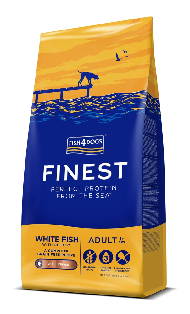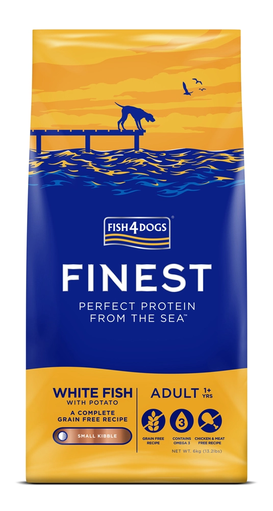 Søger du velsmagende og skånsomt foder til små voksne hunde? Fish4Dogs af hvid fisk med kartofler er afbalanceret, kornfrit og baseret på kvalitetsråvarer fra sæsonens hvide fisk fra det nordlige Atlanterhav. Kombinationen af laksemel og lakseolie giver naturlig omega-3 for vitalitet, hud og pels, mens kartofler og ærtestivelse sikrer let fordøjelighed.