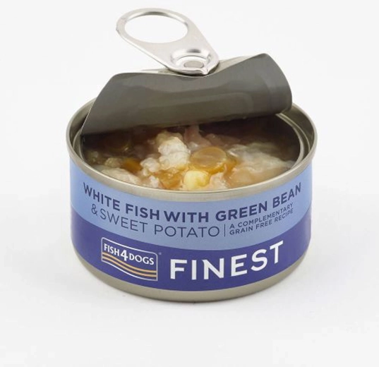 Delikat vådfoder til hunde med et højt indhold af hvid fisk (50 %), suppleret med søde kartofler og grønne bønner. Letfordøjelig opskrift uden korn, uden kunstige farver og smagsstoffer, som glæder selv sarte hunde. Perfekt som velsmagende tilskud eller belønning.