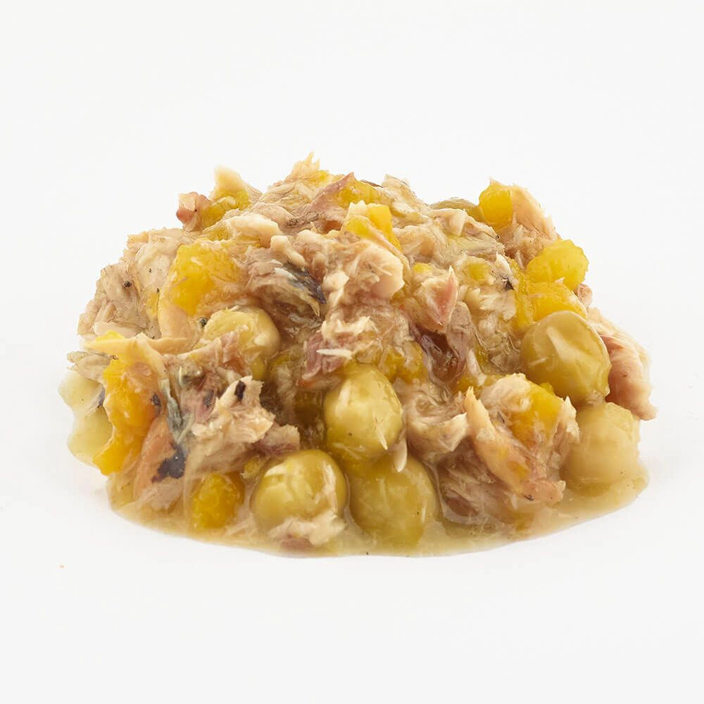 Sammensætning: makrel (50 %), ærter (8 %), græskar (8 %), tapiokastivelse.