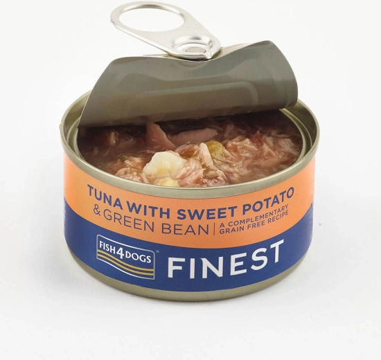 Lækker dåsemad til hunde FISH4DOGS Finest med tun, søde kartofler og grønne bønner er fremstillet af kvalitetsråvarer og tilbyder naturlig, skånsom ernæring. Opskriften er kornfri, uden kunstige farver og smagsstoffer og egner sig som velsmagende supplement til foder eller som godbid. Den saftige tekstur med stykker af tun og grøntsager frister selv kræsne hunde og bidrager til en varieret kost.