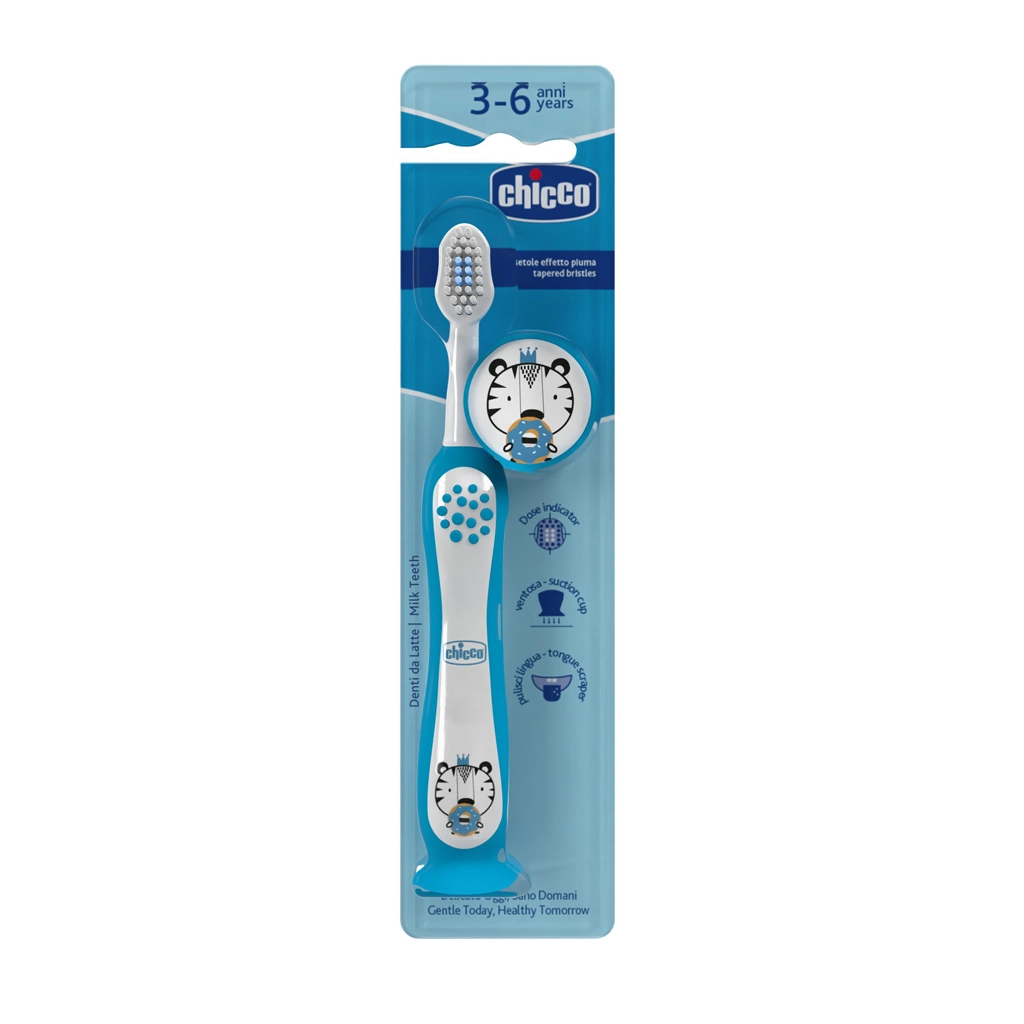 Chicco Tiger børnetandbørste er specielt designet til børn i alderen 3–6 år. Den har ekstra bløde, koniske børstehår for skånsom rengøring af tænder og tandkød, ergonomisk skridsikker håndtag og smalt børstehoved for nem adgang til alle områder i munden. Medfølger hygiejnisk beskyttelseshætte, sugefod til stabil opbevaring og indikator for korrekt mængde tandpasta midt på børstehovedet.