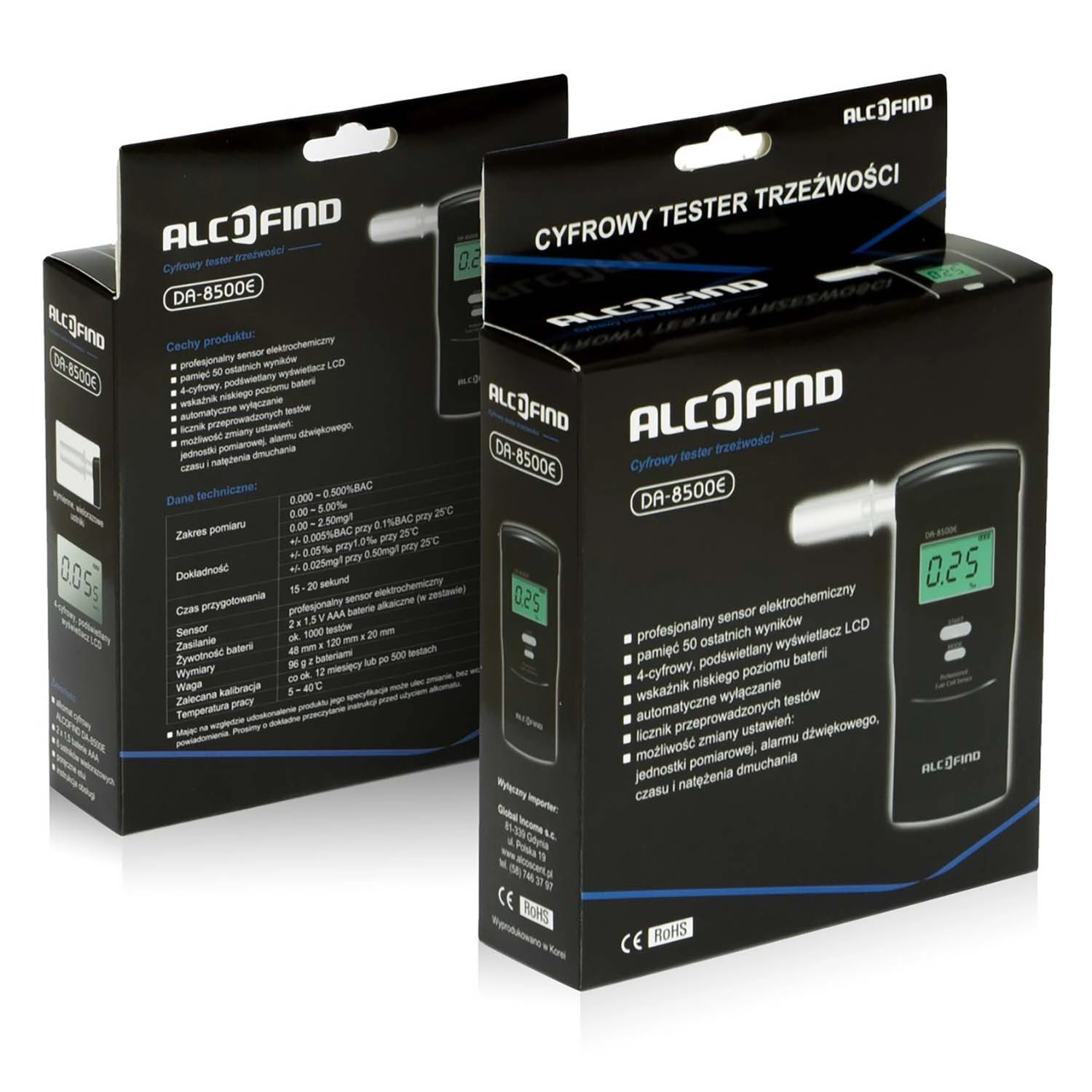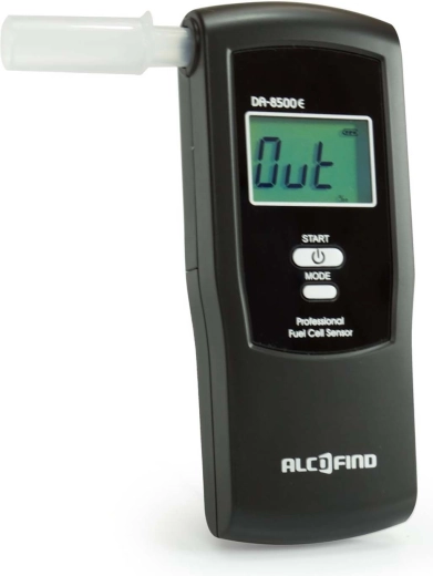 - Alkoholtester DA-8500E, etui, 2× AAA, 6× genanvendeligt mundstykke, 100× engangsmundstykke, DK manual, gaveæske, garantibevis, gratis kalibrering inden for 12 måneder