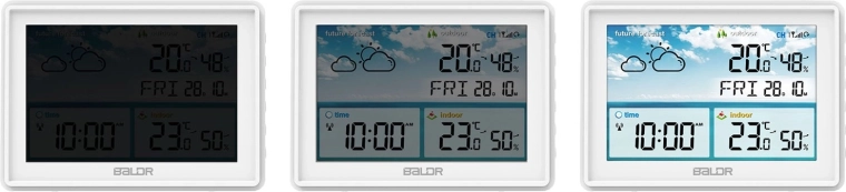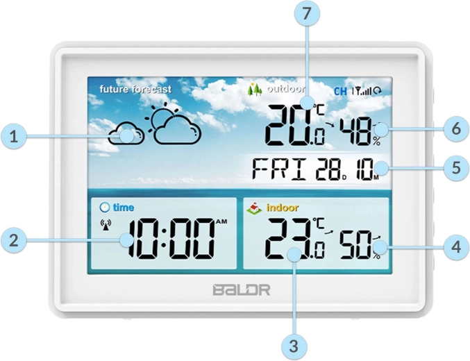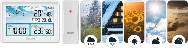 Den store LCD med tydelige ikoner viser aktuelle forhold samt vejrudsigt for de næste 12 timer. Alle nøgledata – temperatur, luftfugtighed, tid og dato – er lette at aflæse.