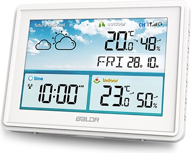 Hvid trådløs vejrstation med DCF-tid og farve-LCD