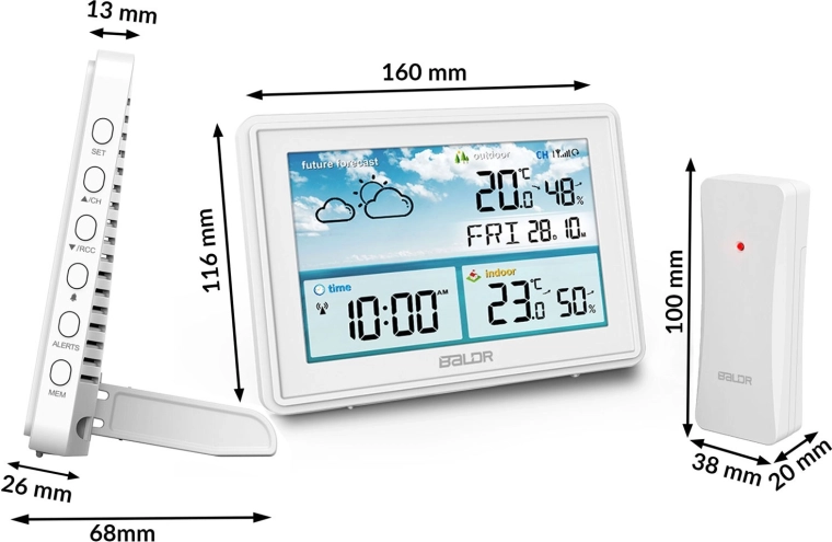 Moderne trådløs vejrstation med automatisk DCF77-tidsynchronisering, 12-timers vejrudsigt og måling af temperatur og luftfugtighed inde og ude. Den tilbyder alarm for høj/lav udendørstemperatur, frostadvarsel, registrering af MAX/MIN-værdier, to niveauer af baggrundsbelysning og en overskuelig LCD-skærm med ur, kalender og alarm.