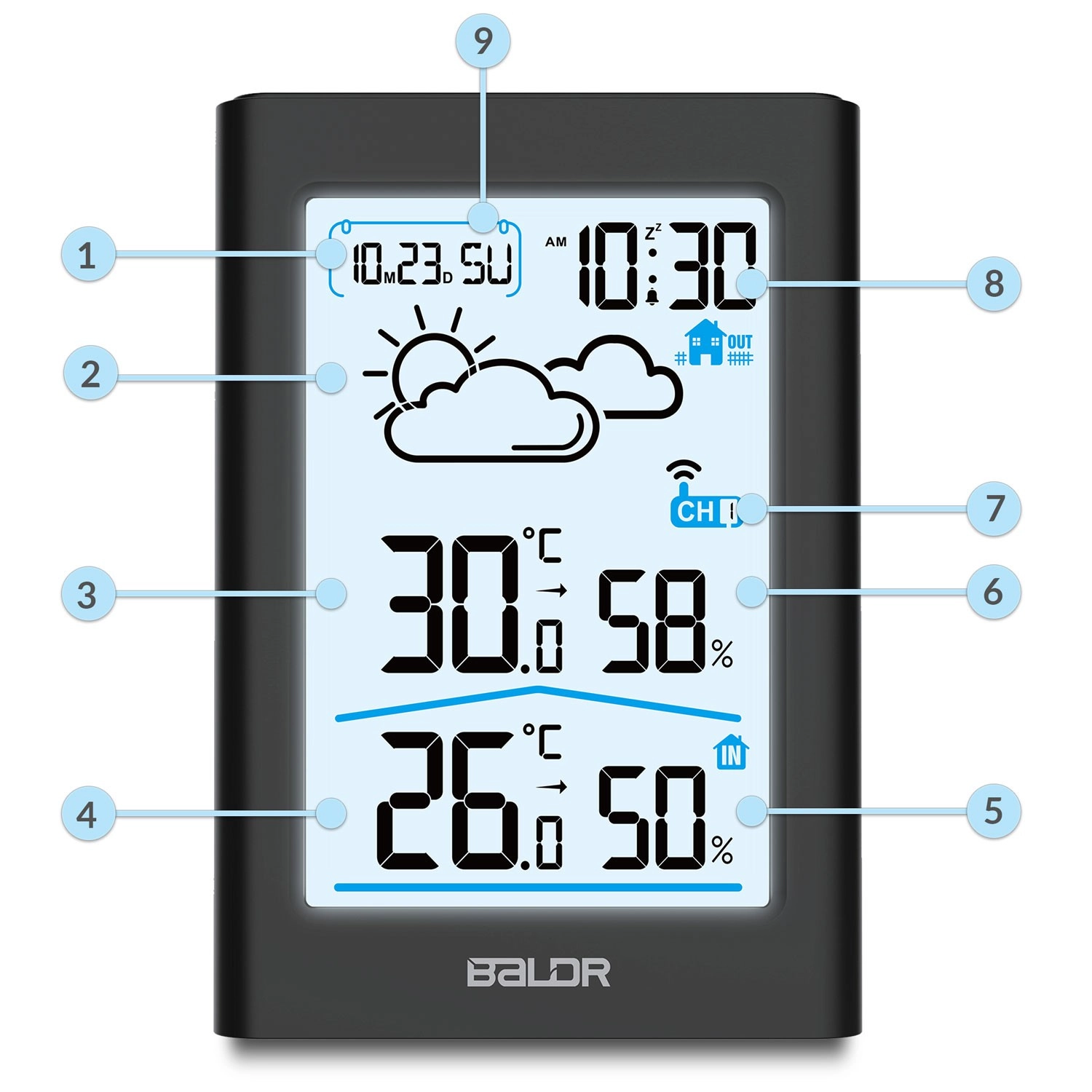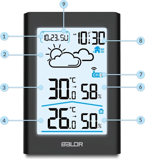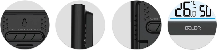 - Vejrudsigt, kalender, alarm, min./maks.-hukommelse, batteristatusindikator, kanalvalg