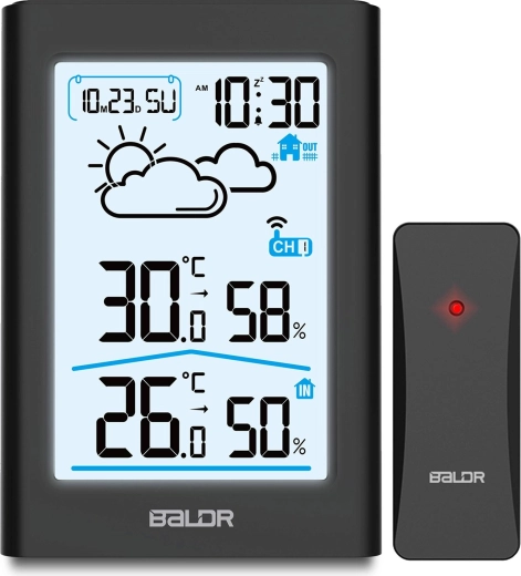 Denne moderne trådløse vejrstation med stort bagbelyst LCD-display giver fuldt overblik over klimaet inde og ude. Den måler og viser indendørs/udendørs temperatur og luftfugtighed, tilbyder vejrudsigtsikoner, aktuelt klokkeslæt med alarm og kalender. Med min./maks.-hukommelsen kan du nemt kontrollere udsving i temperatur og luftfugtighed i løbet af dagen.