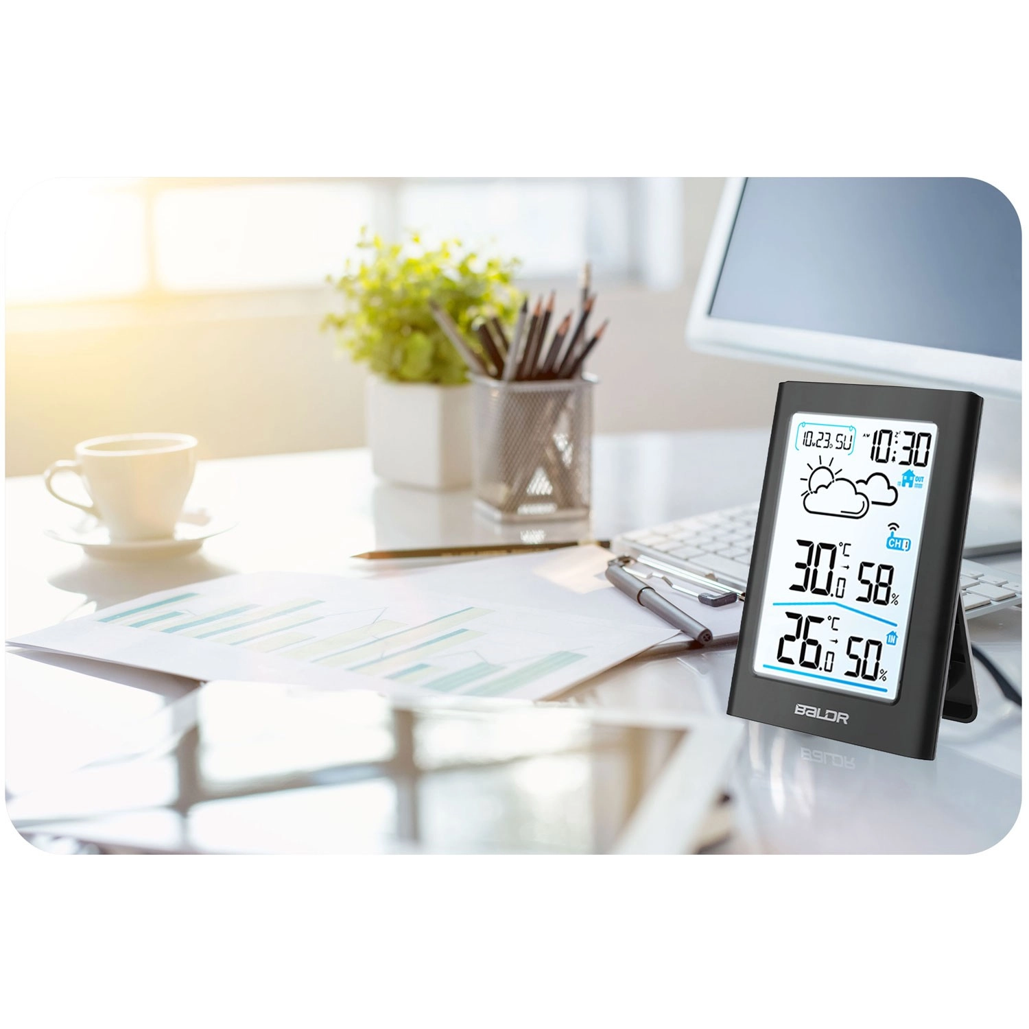 Store, letlæselige cifre viser tid, dato, temperatur og luftfugtighed fra både indendørs og udendørs miljø. Bagbelysning muliggør problemfri aflæsning dag og nat.
