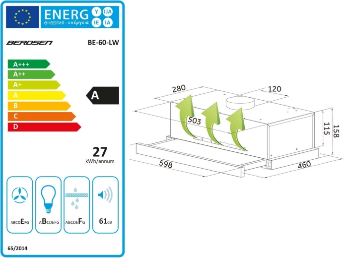 Den kompakte teleskopiske emhætte BERDSEN med 60 cm bredde og kabinet i rustfrit stål tilbyder høj effektivitet op til 200 m³/t, energibesparende LED-belysning og 2 driftsformer – aftræk til skorsten eller recirkulation med kulfilter. Takket være det udtrækkelige panel øges opsamlingsfladen for damp, den er diskret til indbygning og nem at betjene mekanisk.