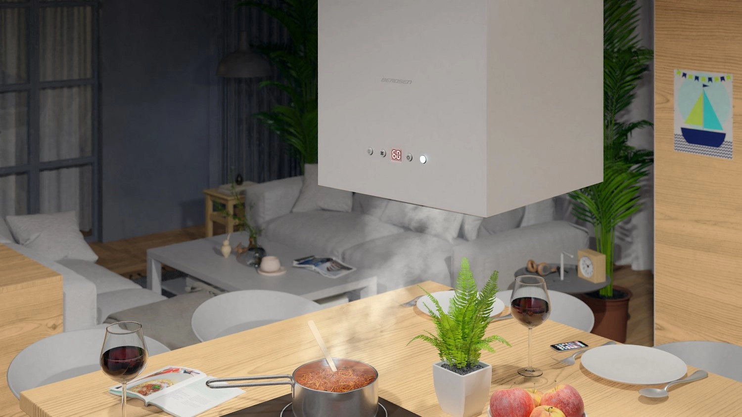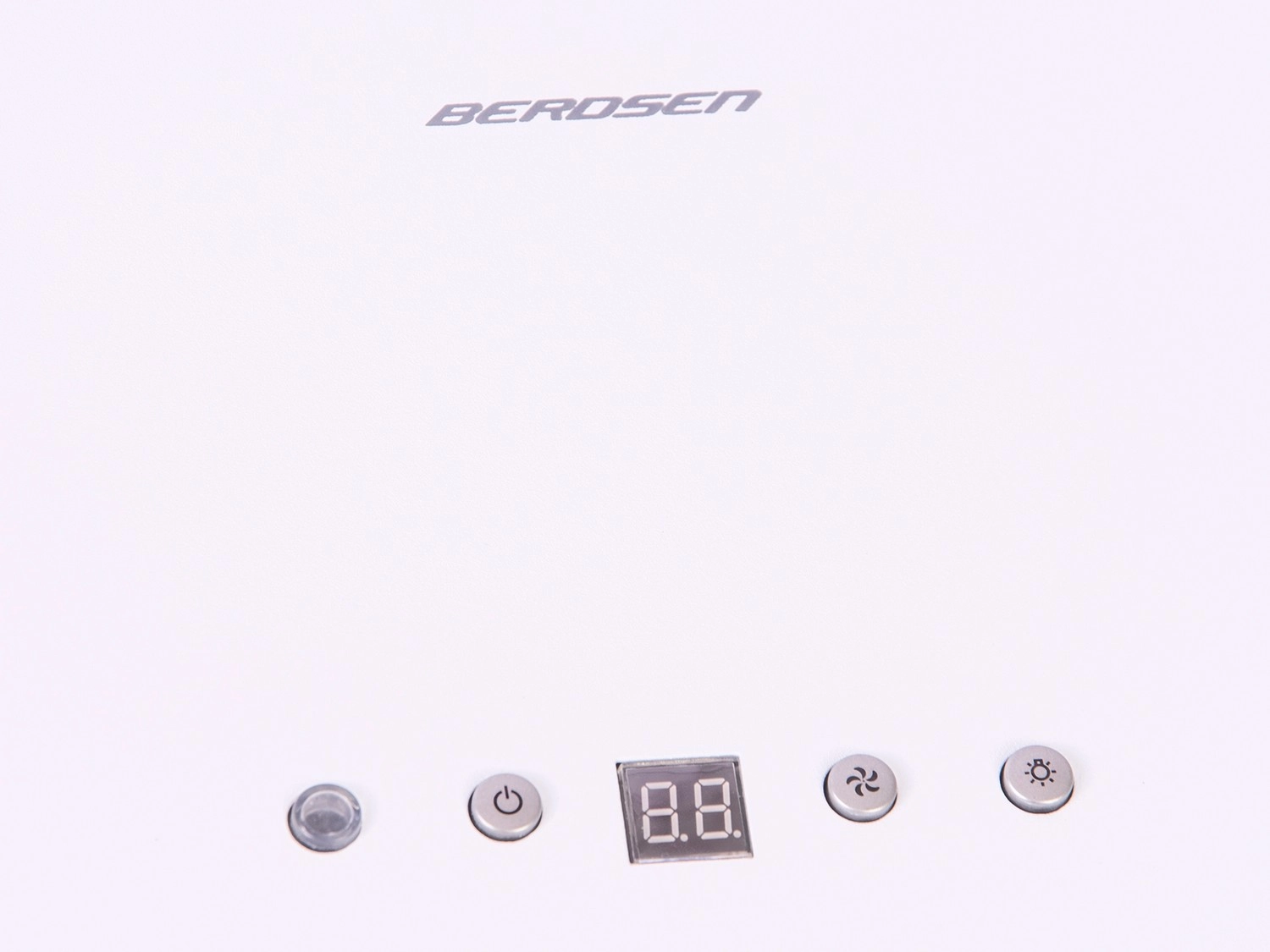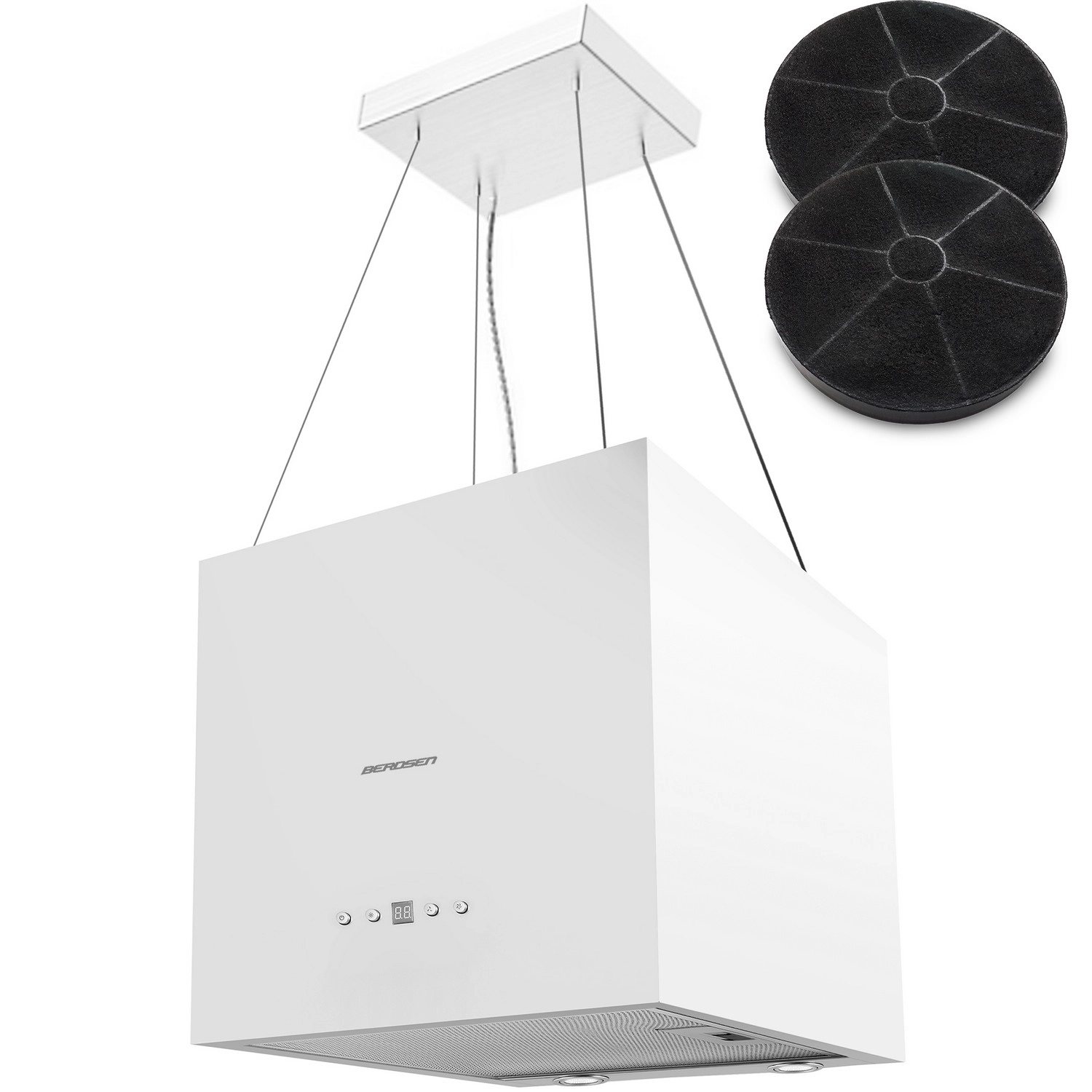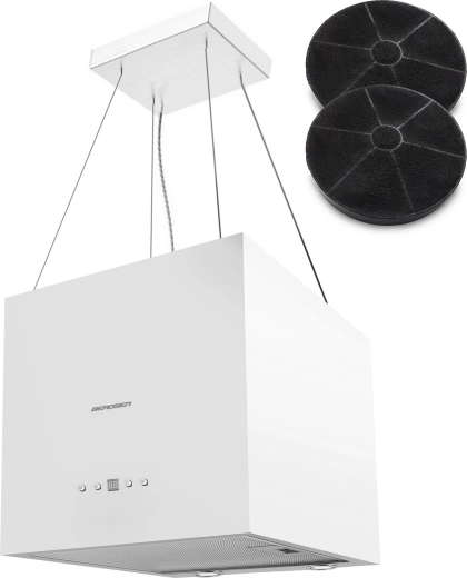 Stilfuld køkkenø-emhætte fra Berdsen med en bredde på 40 cm i hvid, der kombinerer elegant udførelse i rustfrit stål, energibesparende LED-belysning og effektiv recirkulation takket være 2 kulfiltre inkluderet. Den tilbyder 3 hastigheder, elektronisk-mekanisk betjening med knapper samt fjernbetjening og automatisk slukning. Passer perfekt til moderne og minimalistiske køkkener.