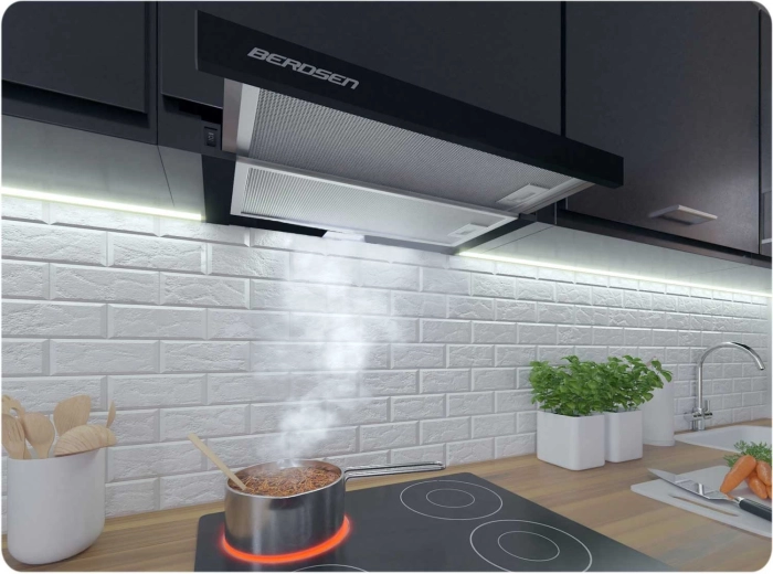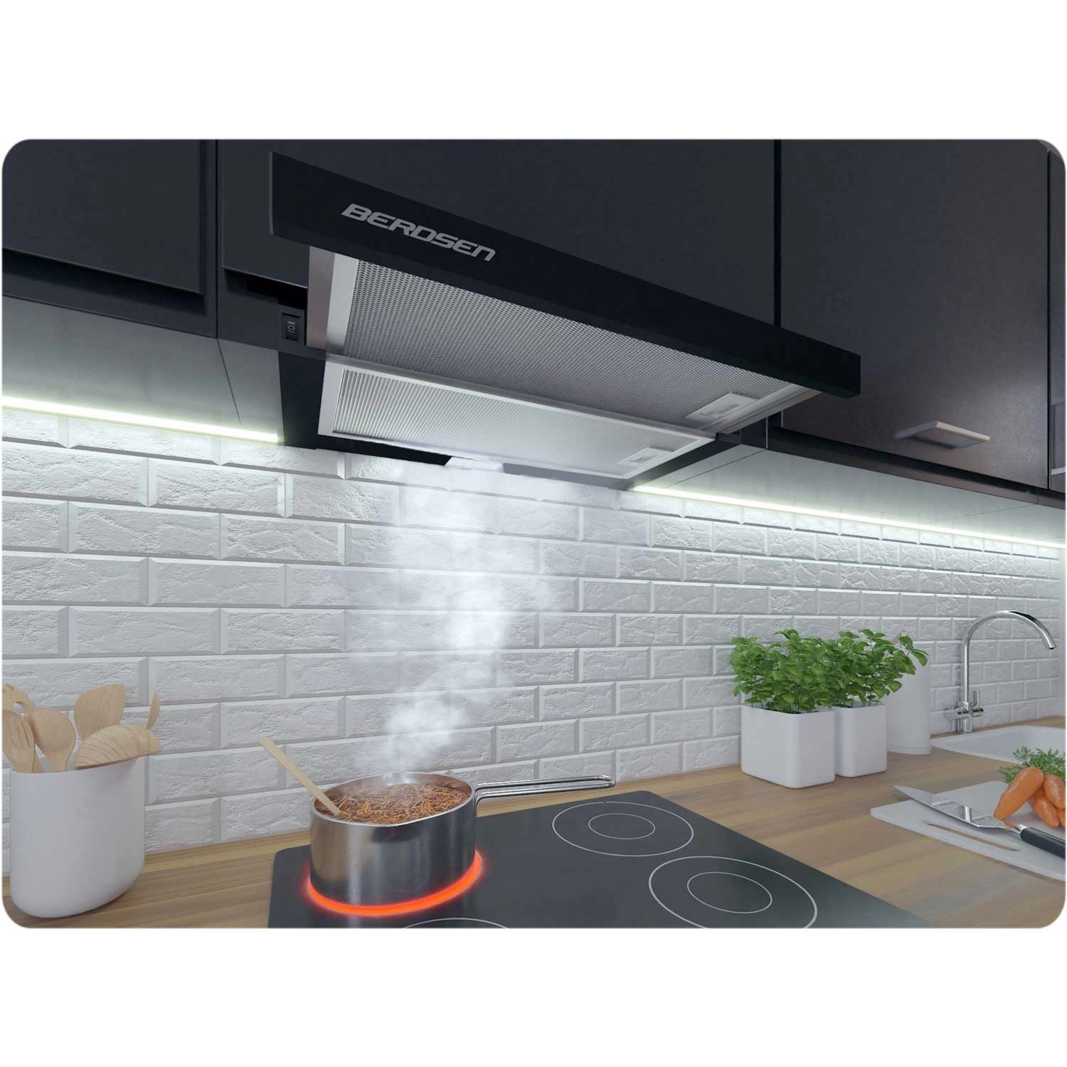Den elegante indbyggede teleskopiske emhætte BERDSEN fjerner effektivt damp, lugte og fedt direkte ved kilden. Med den udtrækkelige skinne får du større indsugningsareal og højere effektivitet, mens det kompakte kabinet forbliver skjult i køkkenelementet. Du vil også sætte pris på den energibesparende LED-belysning på 2 W, som perfekt oplyser kogepladen.