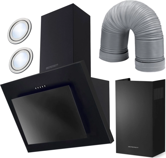 Den elegante skorstenemhætte Berdsen BT-215 i 60 cm kombinerer sort finish, rustfrit stål og hærdet glas. Den tilbyder 3 effekttrin, to driftsmåder (udluftning/recirkulation), energisparende LED-belysning og mekaniske trykknapper. Takket være det aluminiumsfedtfilter i flere lag opfanger den effektivt fedt og holder dit køkken rent.