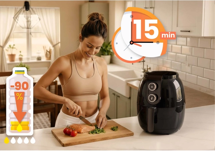 Avanceret cirkulation af varm luft giver gylden overflade og saftigt indre med op til 90 % mindre fedt. Perfekt til pommes frites, kylling og grøntsager.