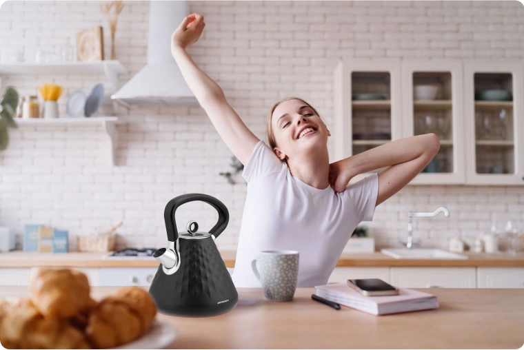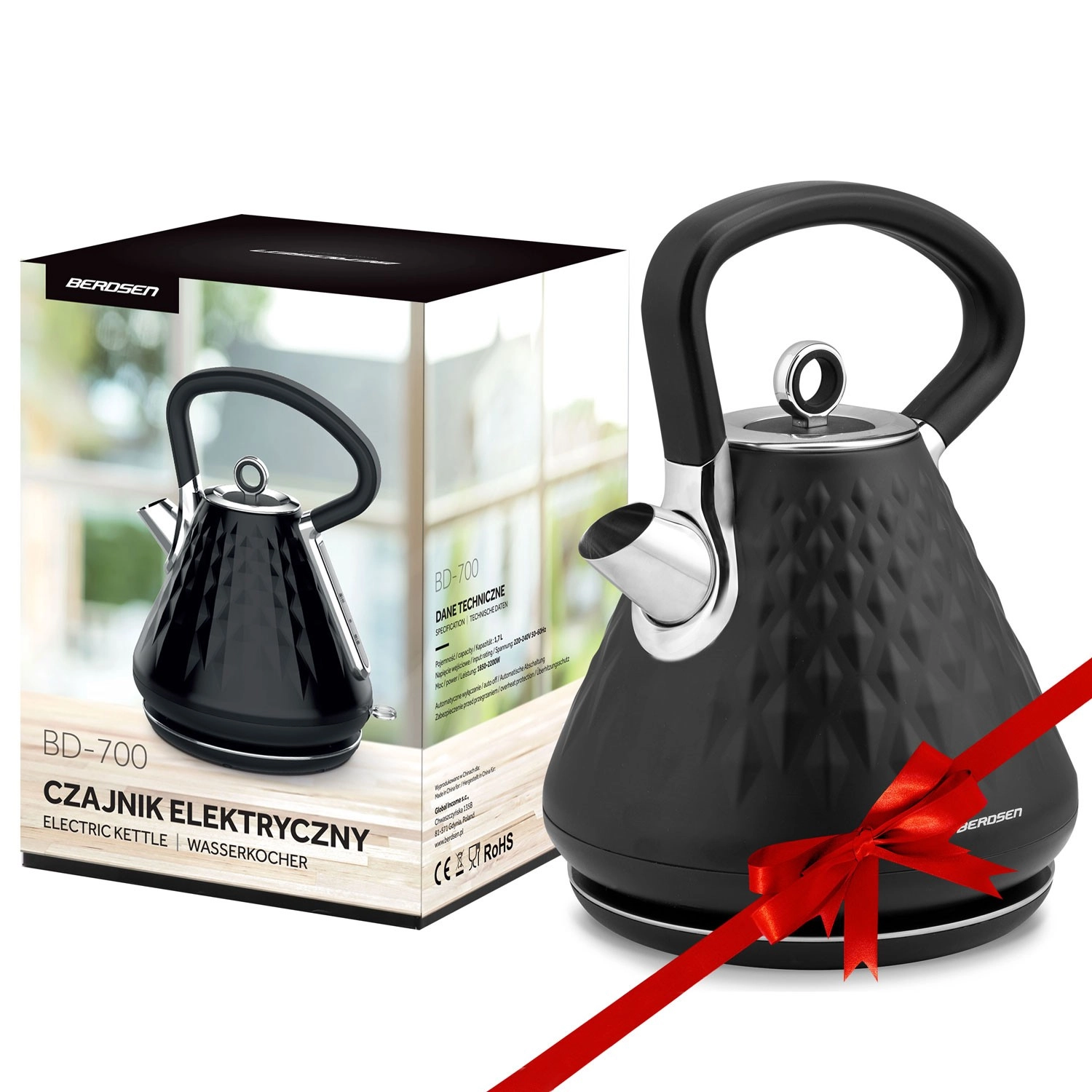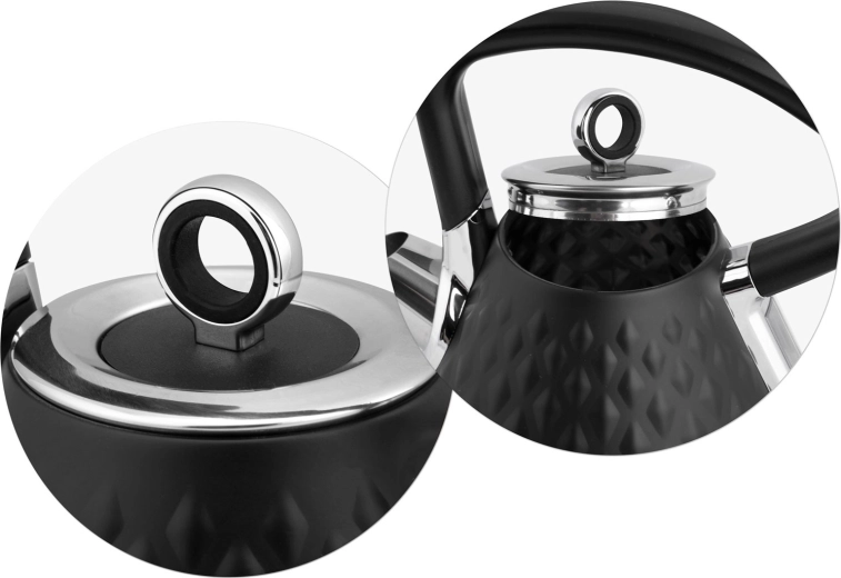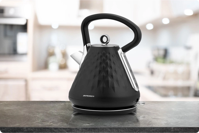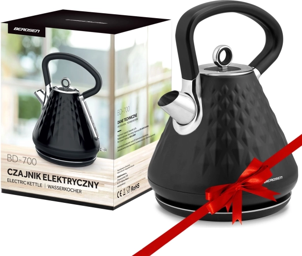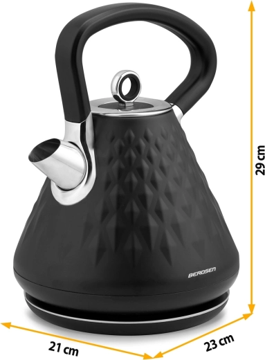 Berdsen-kedlen med metalkabinet og elegant mat overflade med rumlig struktur bliver et smykke i ethvert køkken. Takket være effekt på 1850–2200 W bringer den vand i kog på et øjeblik, mens den 360° drejbare base og skjult kabelopbevaring sikrer maksimal bekvemmelighed på køkkenbordet.
