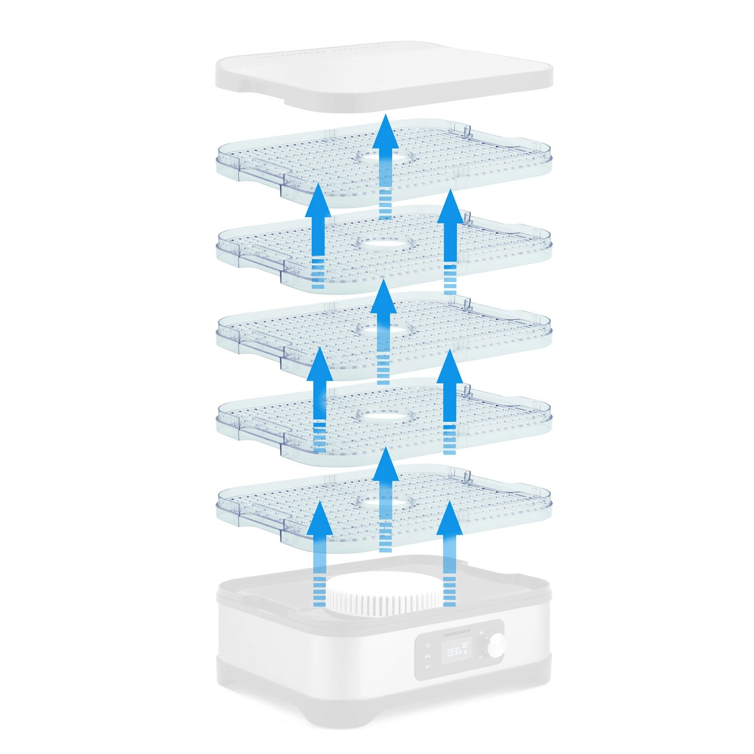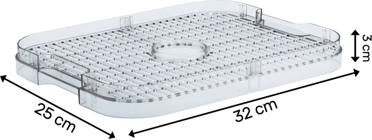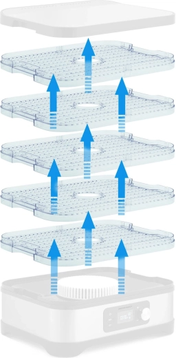Den transparente perforerede bakke skubbes nemt ind som et ekstra lag og øger straks tørrearealet, så du kan tørre flere råvarer på én gang.