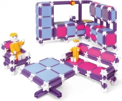 Byggesættet SEVA RODINA – Bolig tilbyder et væld af muligheder for små byggere. Takket være kombinationen af lilla, pink og lyseblå opstår der unikke modeller, som vil glæde hvert barn. Byg en behagelig “landingsbane” – en bred seng, et moderne hjørnekøkken med vask og indbygget køleskab, spiseplads, sofa, hylder, skabe og smarte reoler.