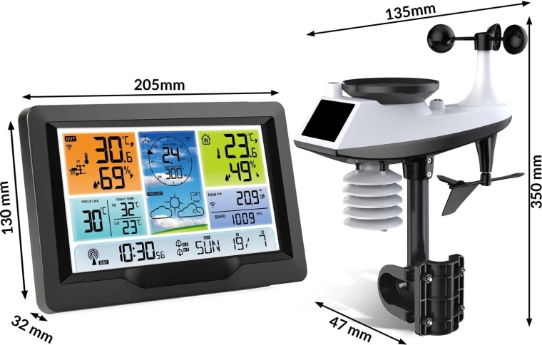 - Komplet vejroversigt: temperatur, fugtighed, tryk, vind (0–180 km/t), vindretning (0–359°), nedbør (0–9999 mm), følt temperatur.