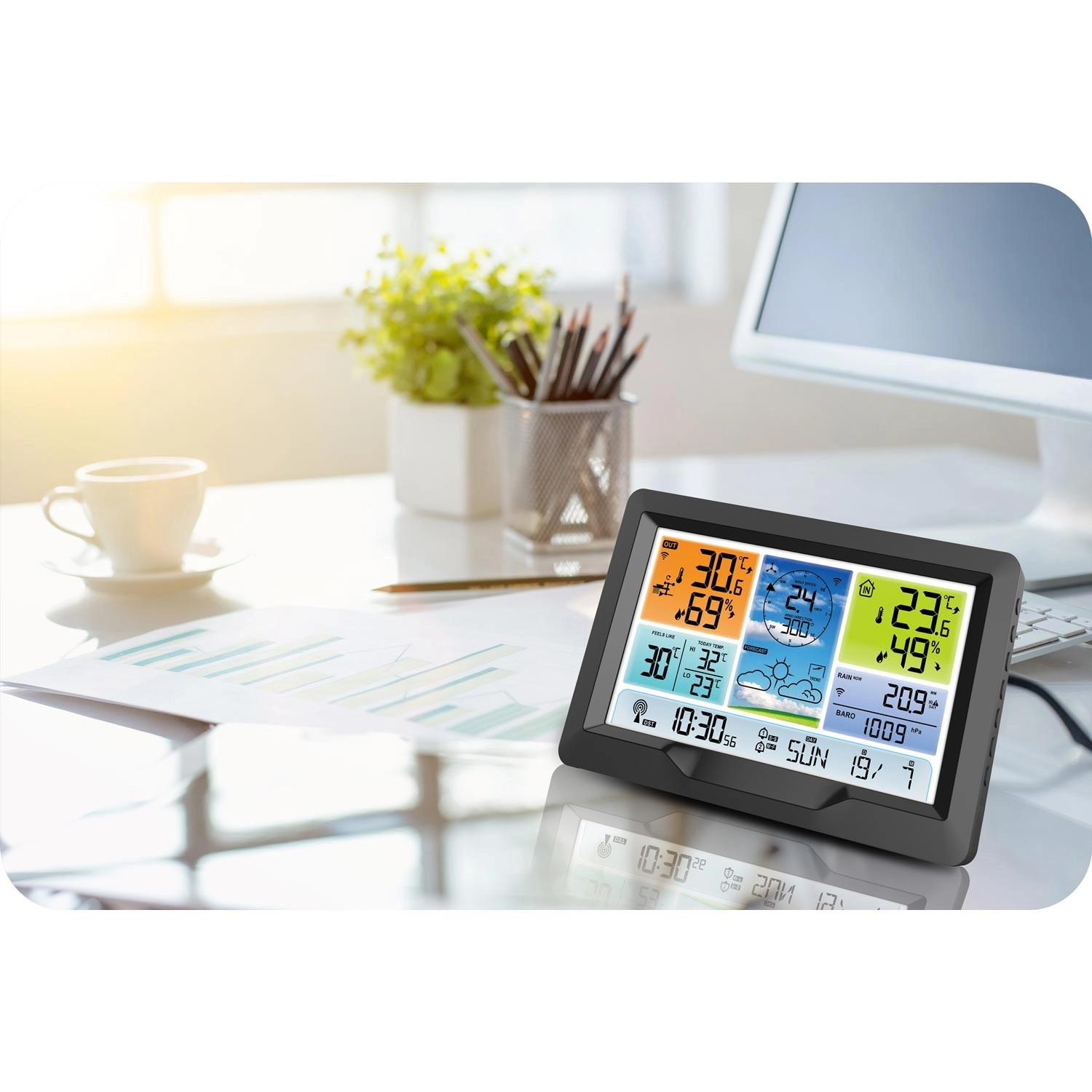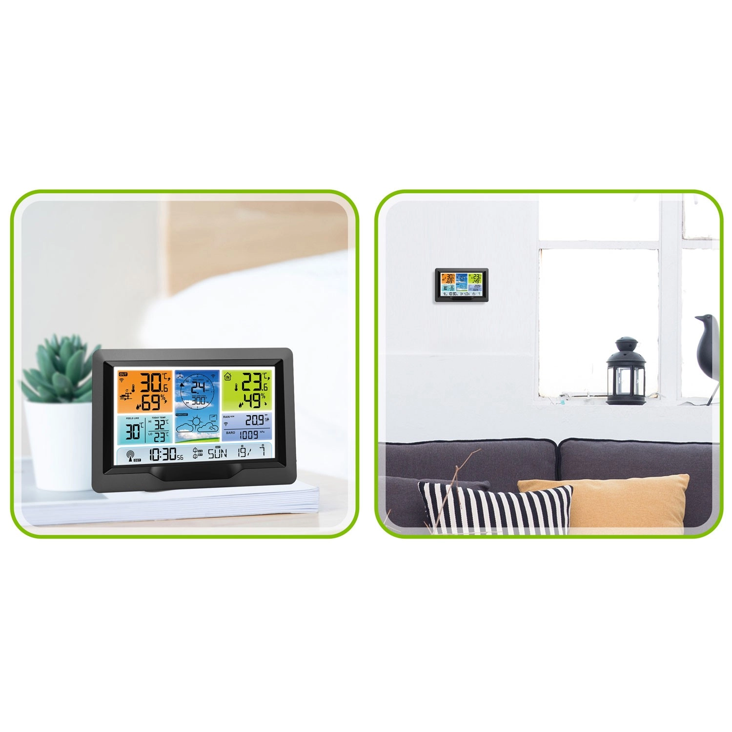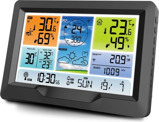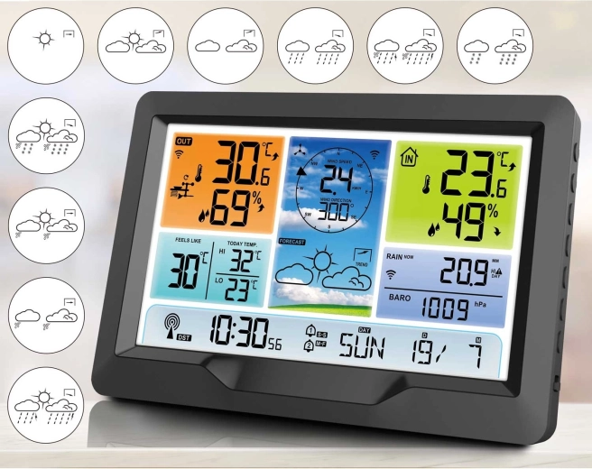 Moderne trådløs vejrstation med farve-LCD, tidssynkronisering via DCF77 og en kraftig udendørs multisensor, der giver 12-timers vejrudsigt samt måling af temperatur, luftfugtighed, tryk, vind og nedbør. Den tilbyder temperaturalarm, MIN/MAX-hukommelse, følt temperatur-indikator, kalender, alarm med snooze og tredelt bagbelysning. Trådløs sensorrækkevidde op til 100 m og mulighed for solcelledrift giver et nemt dagligt overblik over vejret.