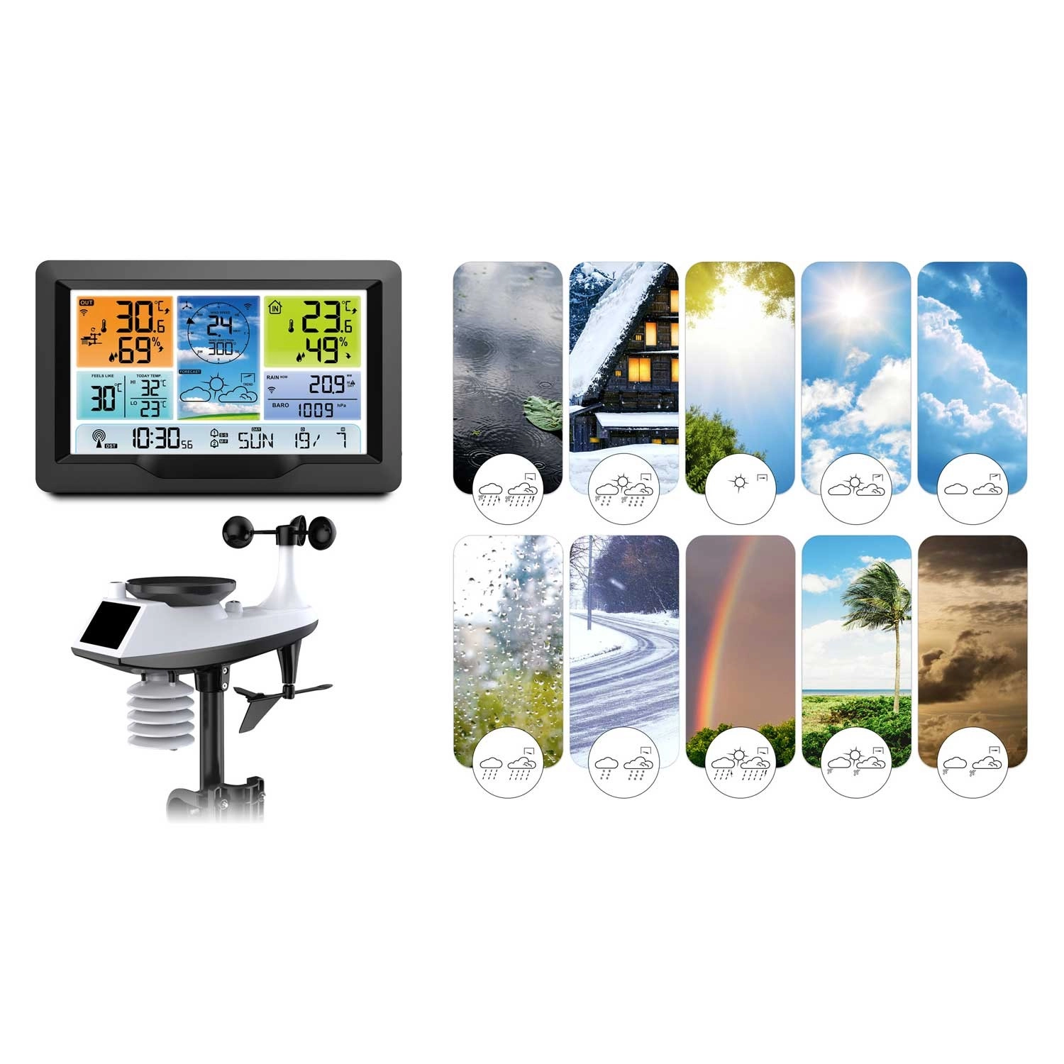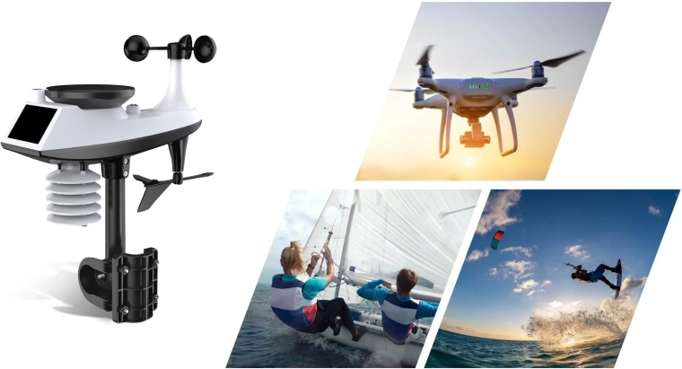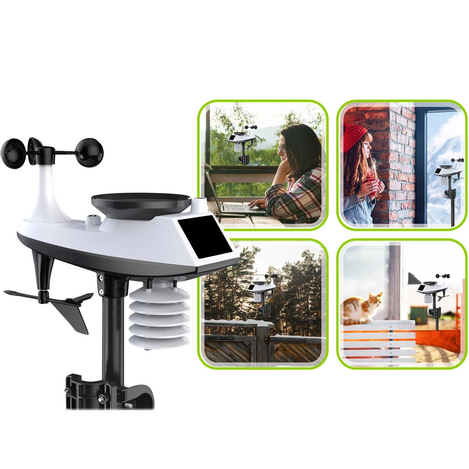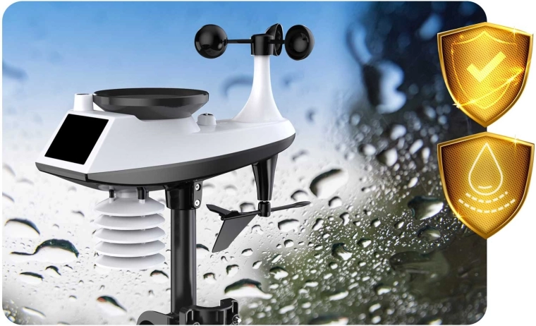 Måler vindhastighed og -retning, nedbørsmængde, udendørstemperatur og -fugtighed. Stabil trådløs overførsel op til 100 m og solcelleassisteret strømforsyning.