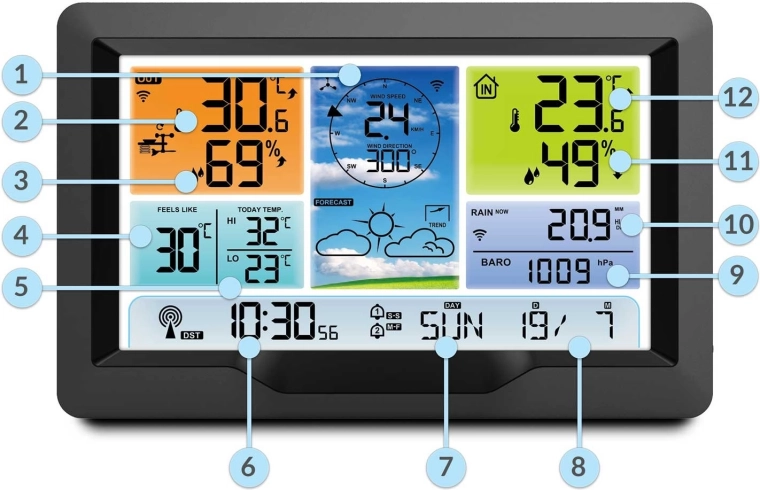 Denne komplette hjemmevejrstation leverer præcise og letlæselige data for både inde og ude. Overvåg udendørs og indendørs temperatur og luftfugtighed, barometertryk med 12 t historik, vindhastighed og -retning samt nedbørsmængde. Den integrerede 12-timers vejrudsigt og trendindikatorer hjælper dig med at planlægge dagen bedre.