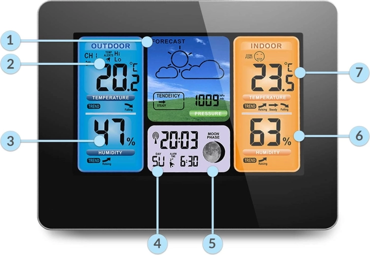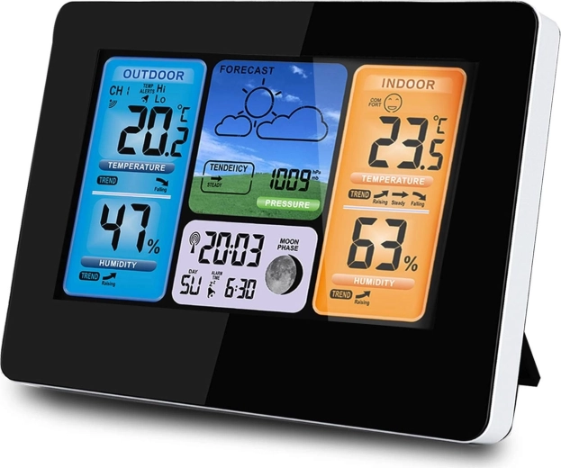 Oprethold ideelt klima inde og ude takket være den integrerede hygrometer og det overskuelige flerfarvede LCD. Stationen analyserer løbende temperatur, fugt og tryk for at give en hurtig og forståelig vejrprognose for de næste 12 timer inklusive trendikoner. Praktiske funktioner som komfortniveau, månens faser, 12/24-timers tid, kalender til år 2099 og vækkeur med snooze gør den til en alsidig hjælper i hverdagen.