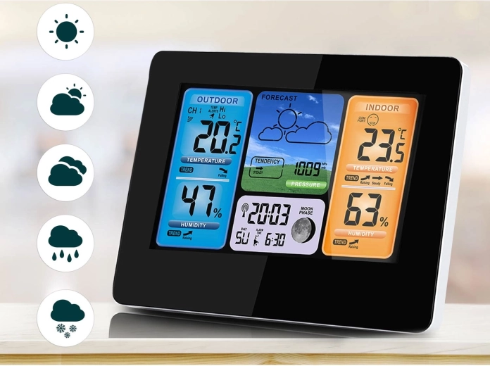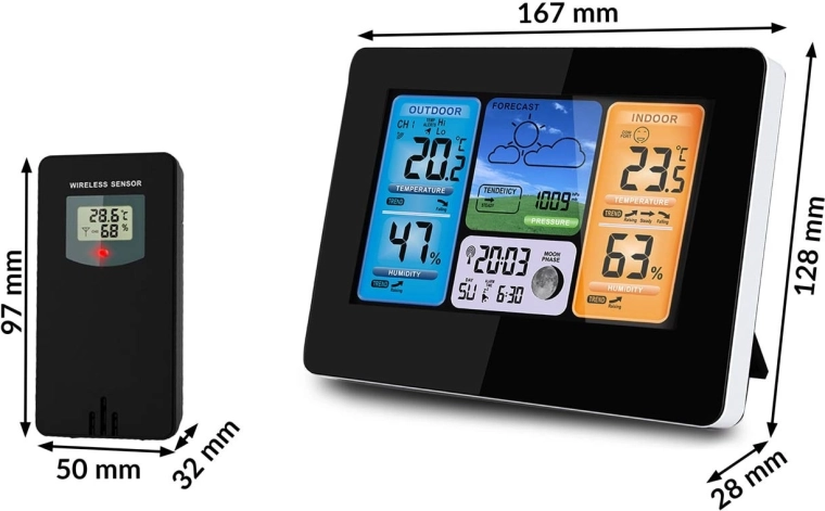 Moderne trådløs vejrstation med farvet LCD, der giver præcis 12-timers vejrprognose, overvåger indendørs og udendørs temperatur og luftfugtighed, viser barometrisk tryk, Månens faser samt tid og kalender. Den tilbyder frost-/hedealarm, vækkeur med snooze og firetrins bagbelysning for let aflæsning. En trådløs sensor med rækkevidde op til 60 m og mulighed for tilslutning af ekstra følere sikrer pålidelig måling til både hjem og have.