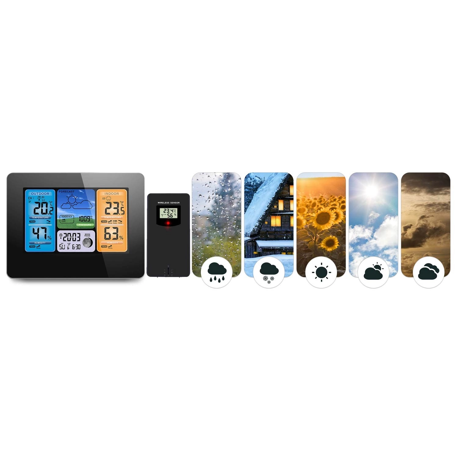 Stationen evaluerer løbende temperatur, luftfugtighed og barometrisk tryk og viser tydelige vejrikoner inklusiv trends. Du kan hurtigt vurdere udviklingen i løbet af dagen.