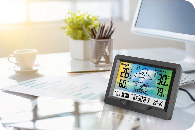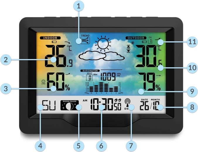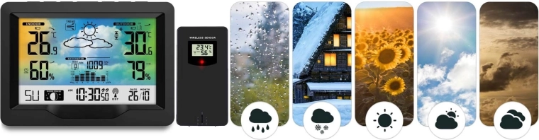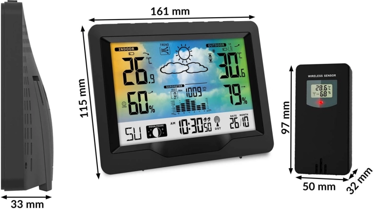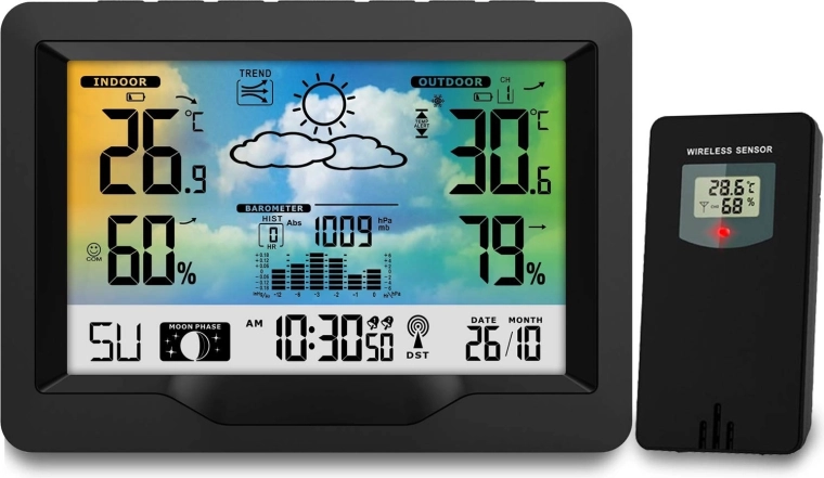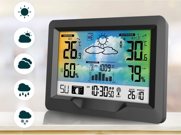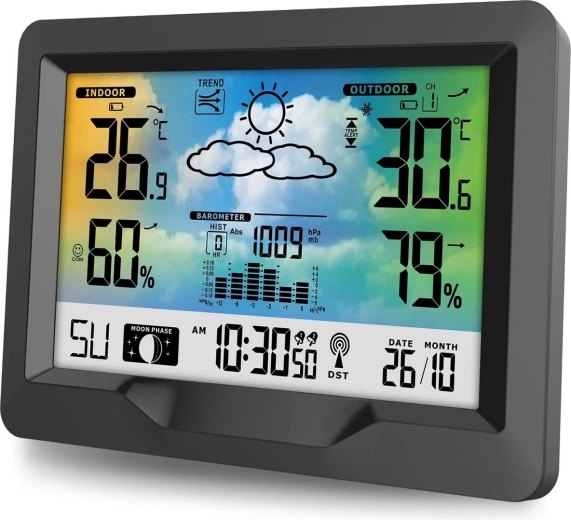 Smart trådløs vejrstation med stort farve-LCD, der tydeligt viser 12-timers vejrudsigt, temperatur og luftfugtighed inde og ude, barometertryk, Månens faser samt nøjagtig tid via DCF77. Indeholder også temperaturalarm, vækkeur med snooze, kalender, komfortindikator og klart baglys for nem aflæsning hele dagen.