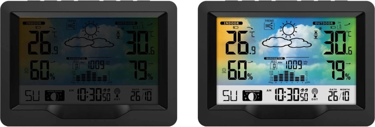 Det store farve-LCD med valgfrit baglys (høj/lav lysstyrke) viser samtidig inde-/udetemperatur og -fugtighed, tryk, Månens faser, dato og ugedag.