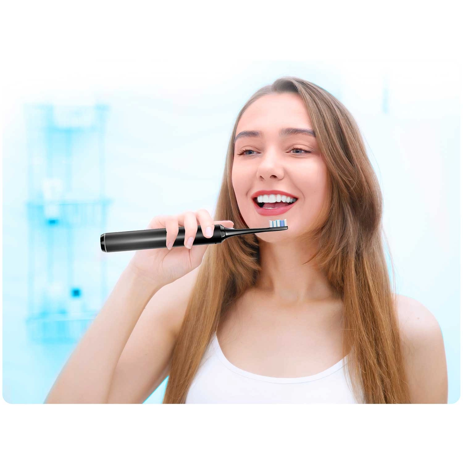 Det minimalistiske kabinet ligger godt i hånden, den vandtætte konstruktion sikrer sikker brug på badeværelset, og multizone-børster renser effektivt selv vanskeligt tilgængelige områder.