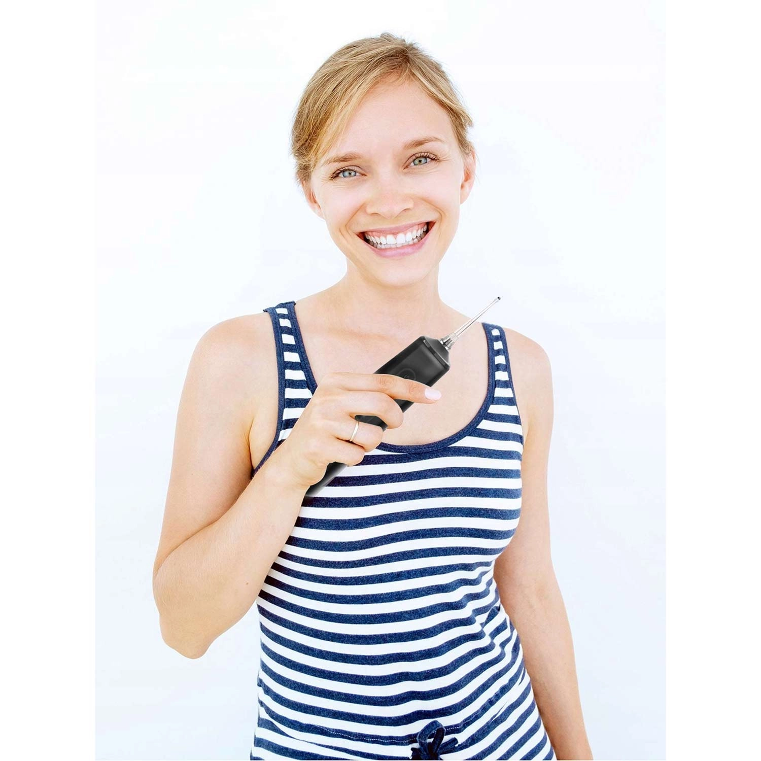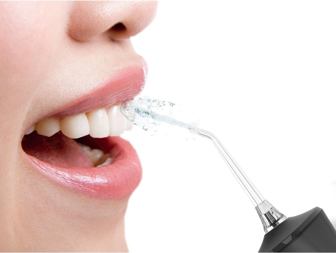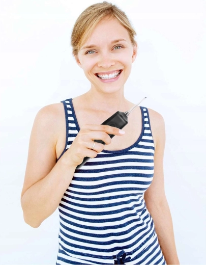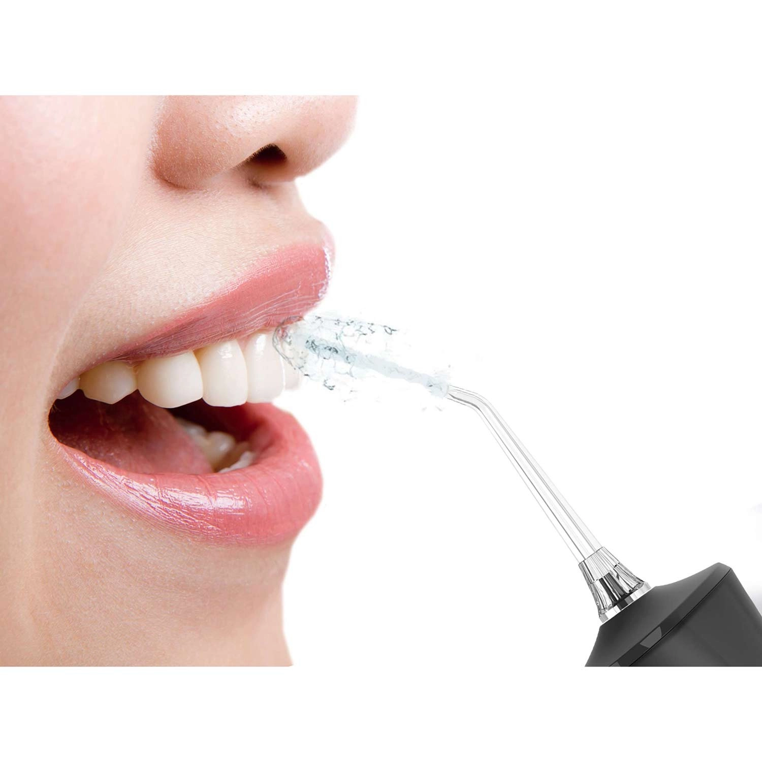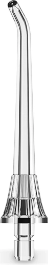 Den smalle, let bøjede dyse leder en kraftig, men skånsom vandstråle præcist derhen, hvor den behøves – mellem tænderne og langs tandkødsranden. Et effektivt alternativ til tandtråd.