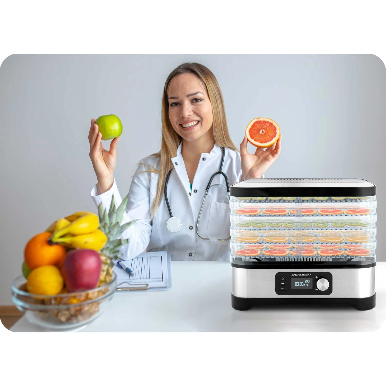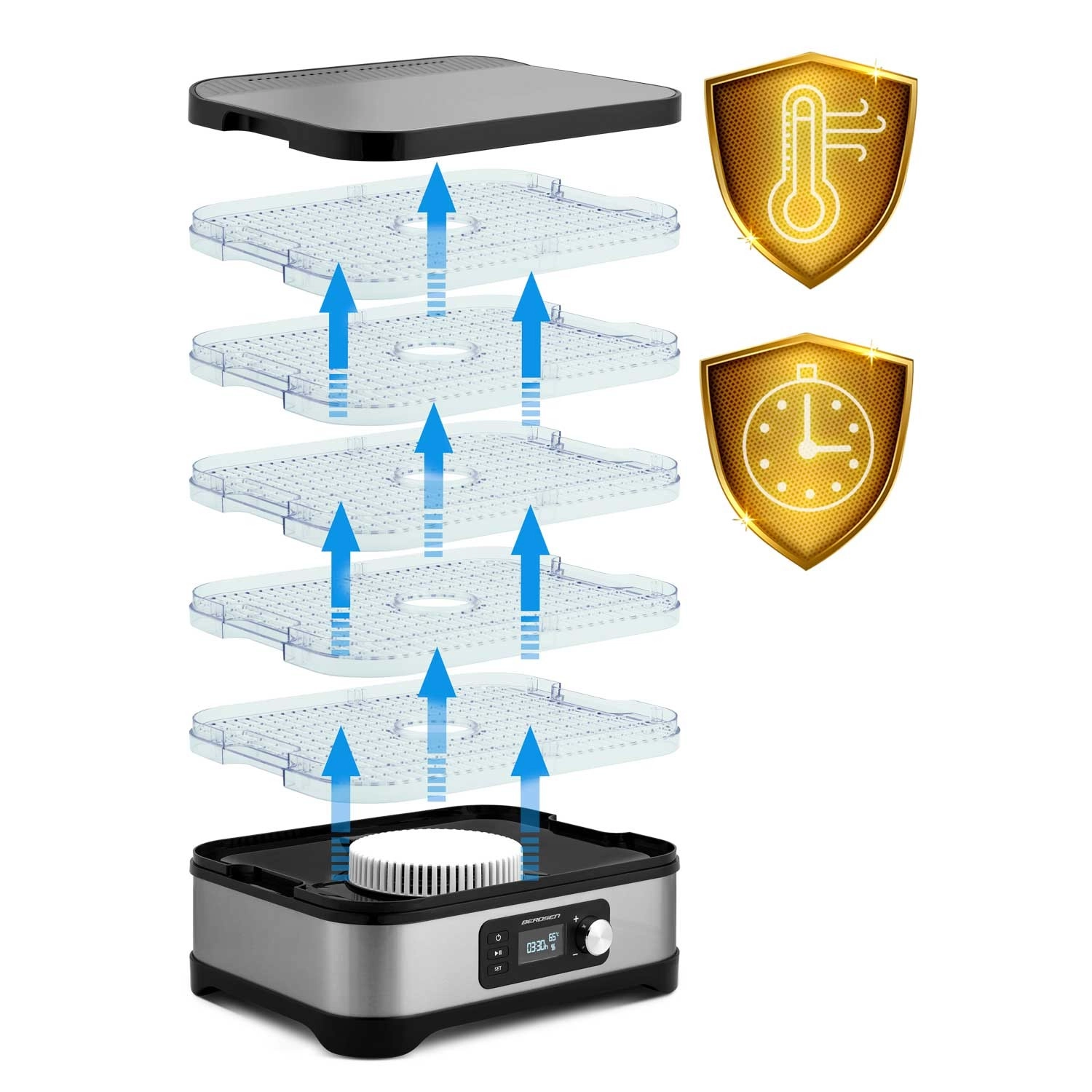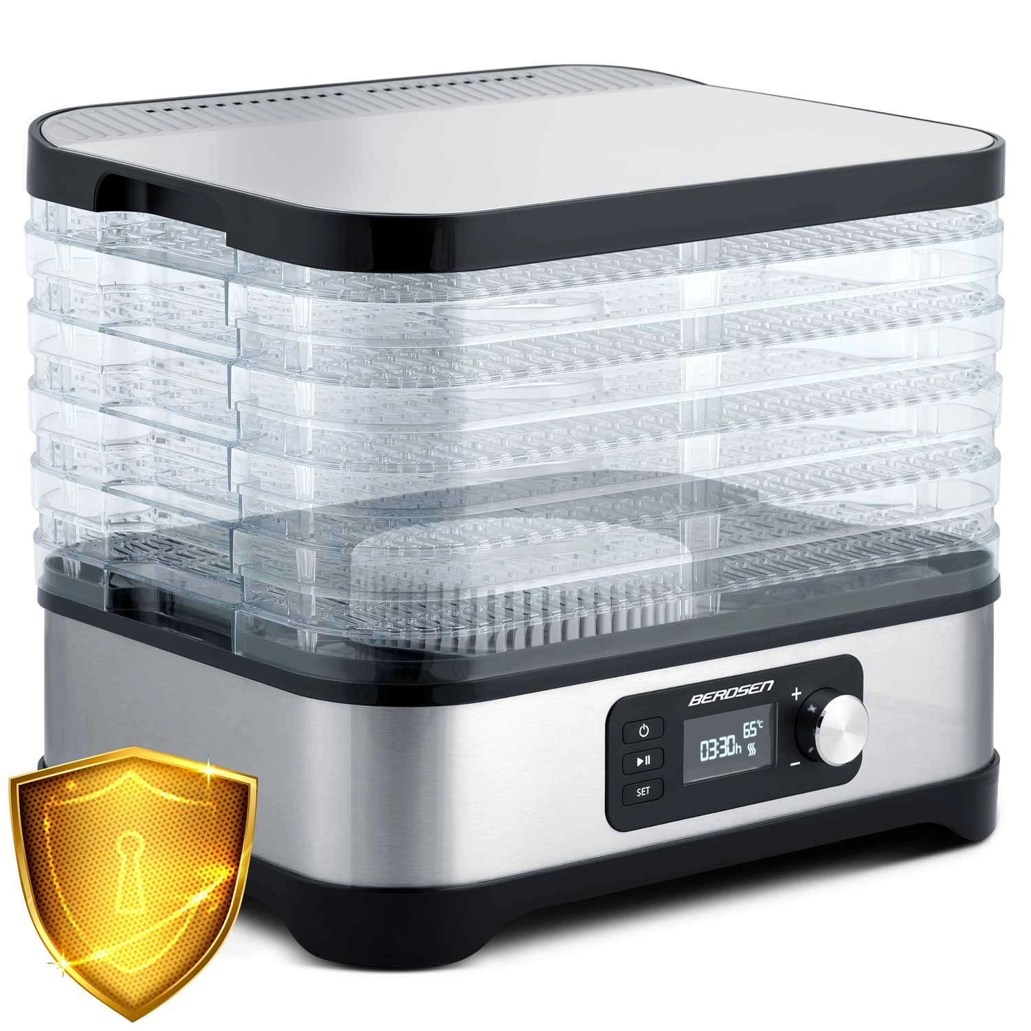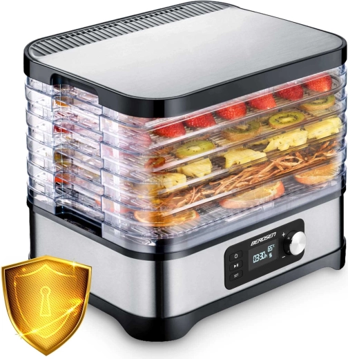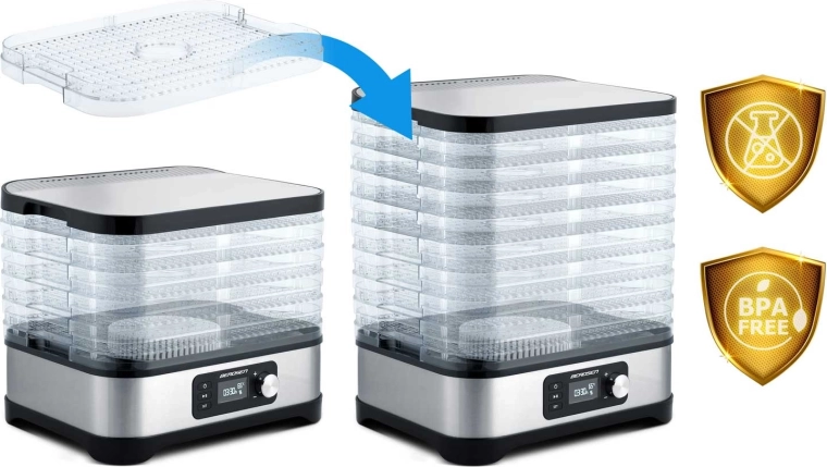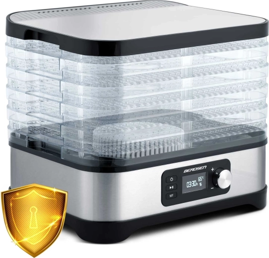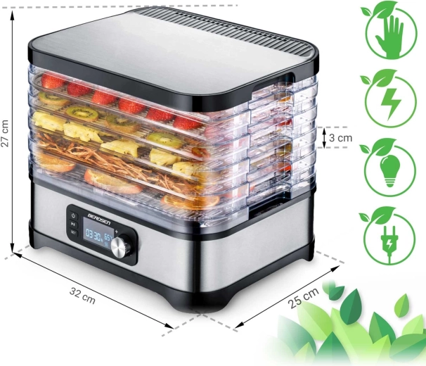 Hjemmetørring af frugt, grøntsager, svampe, urter og kød har aldrig været lettere. Berdsen madtørrer tilbyder kapacitet på 10 l, 5 stabelbare bakker, trinfri temperaturregulering 35–70 °C og timer 1–24 t. Takket være jævn luftcirkulation får du sprøde og velsmagende snacks uden tilsat sukker eller konserveringsmidler. Naturligvis med overophedningsbeskyttelse og nem rengøring.