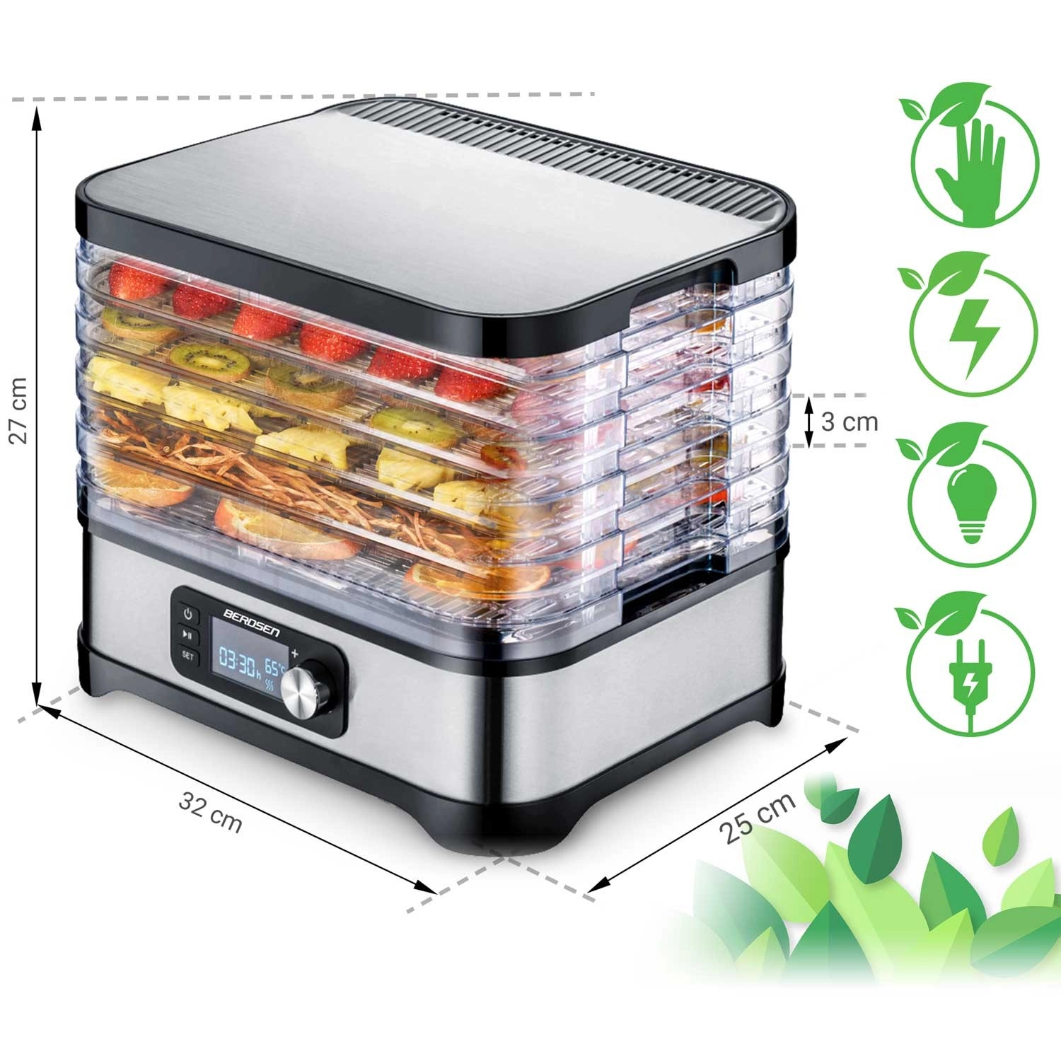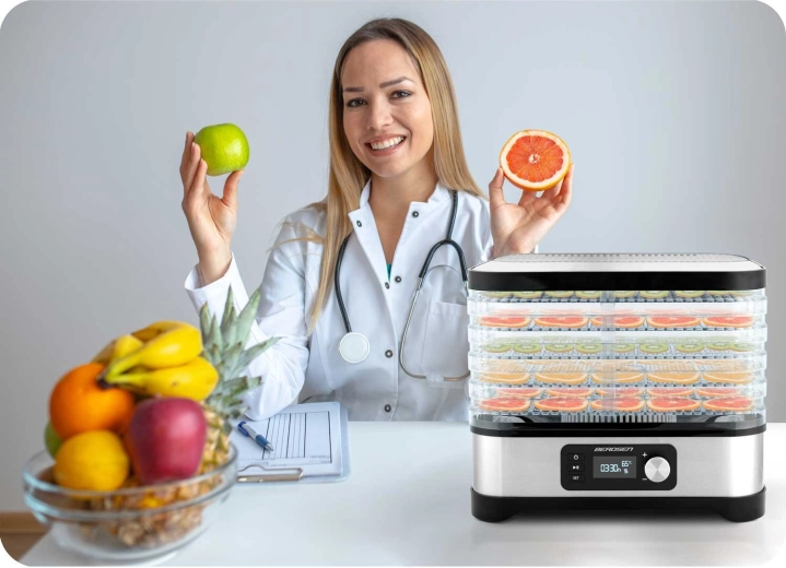 Nyd sunde snacks hele året – tørrede æbler, blommer, jordbær, urter og svampe tilberedes præcis efter din smag. Berdsen-tørreren kombinerer effektiv opvarmning på 400 W med præcis elektronisk temperaturkontrol, så der tørres skånsomt og jævnt. Det intuitive panel lader dig indstille timer 1–24 timer for bekymringsfri drift.