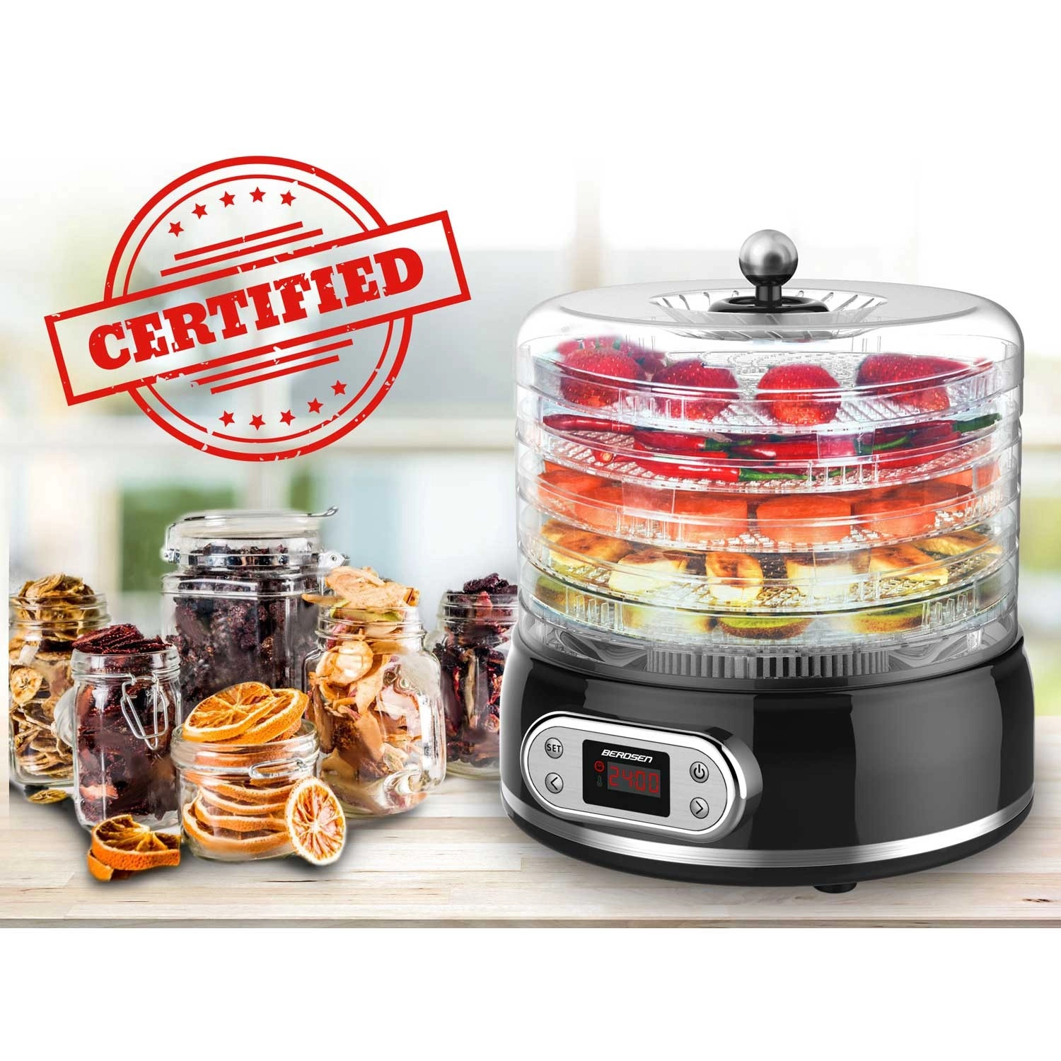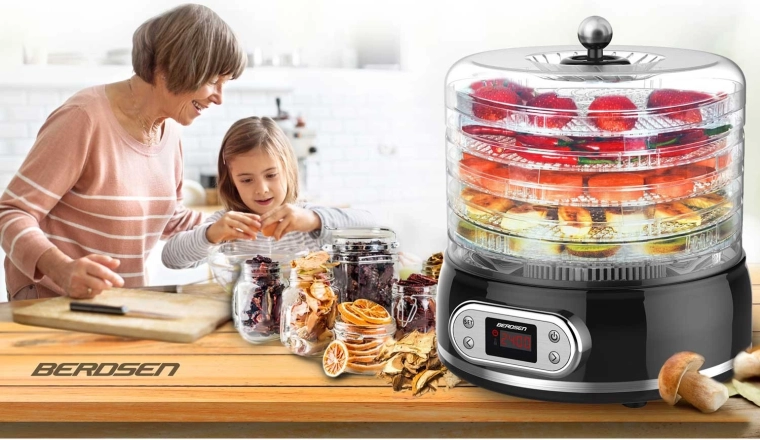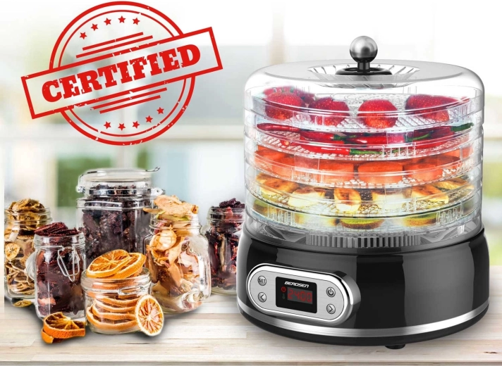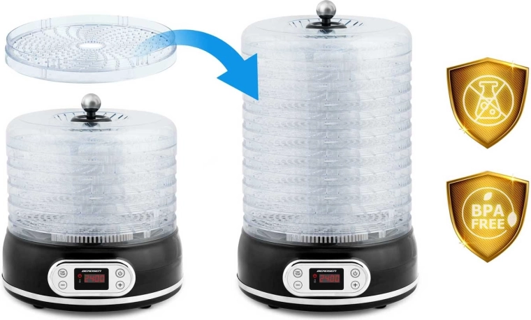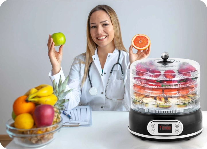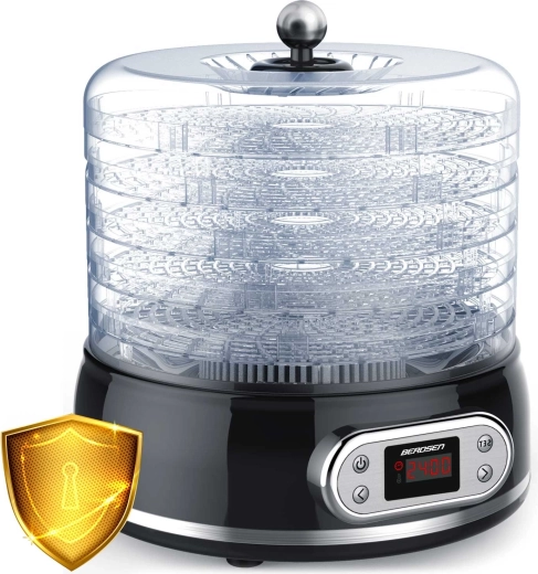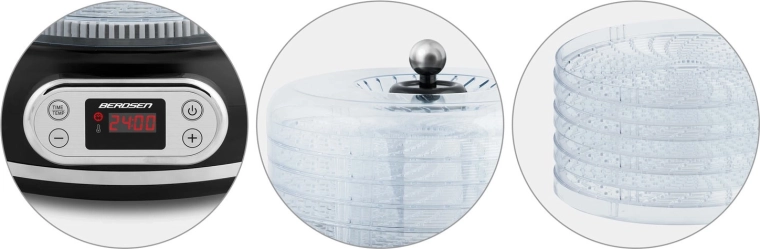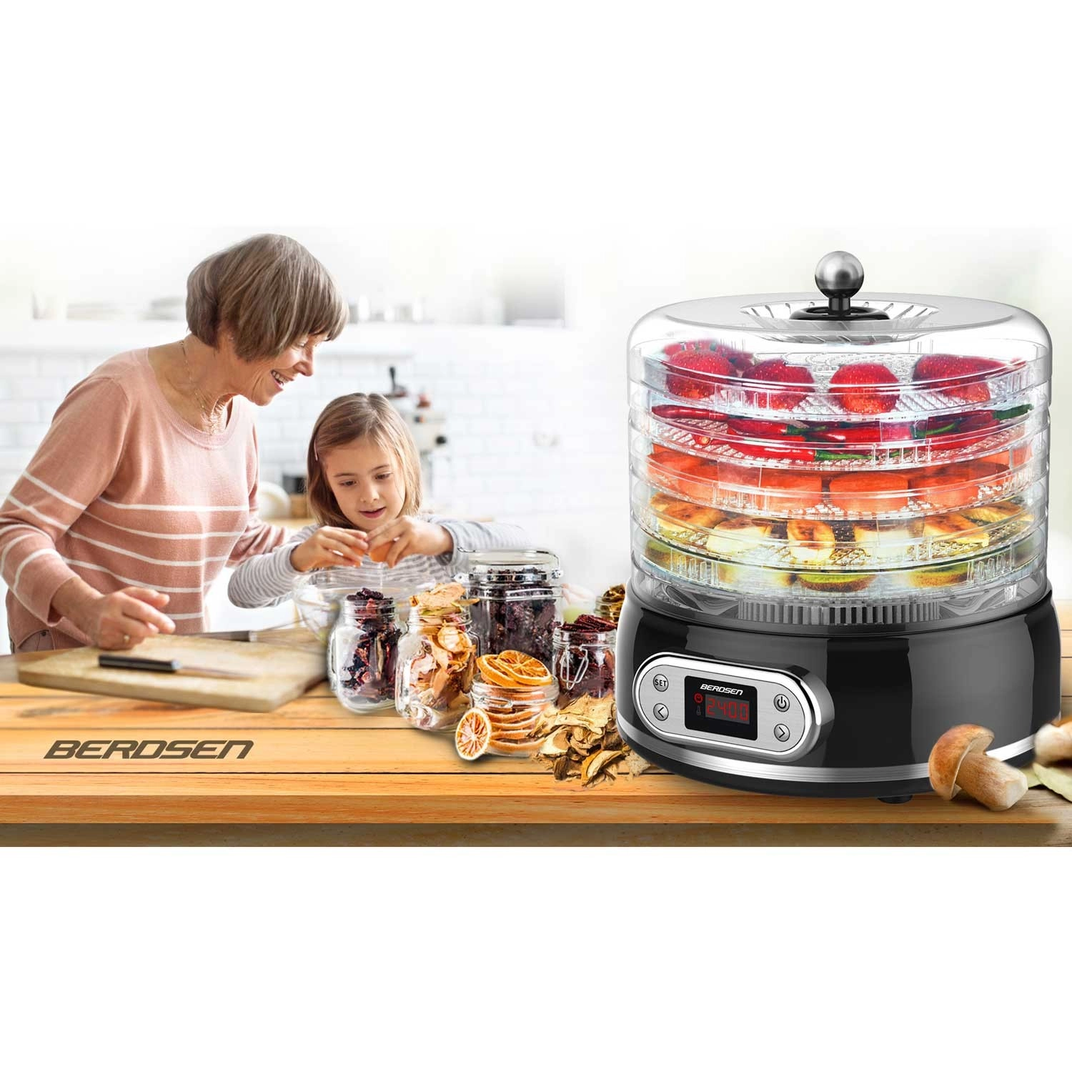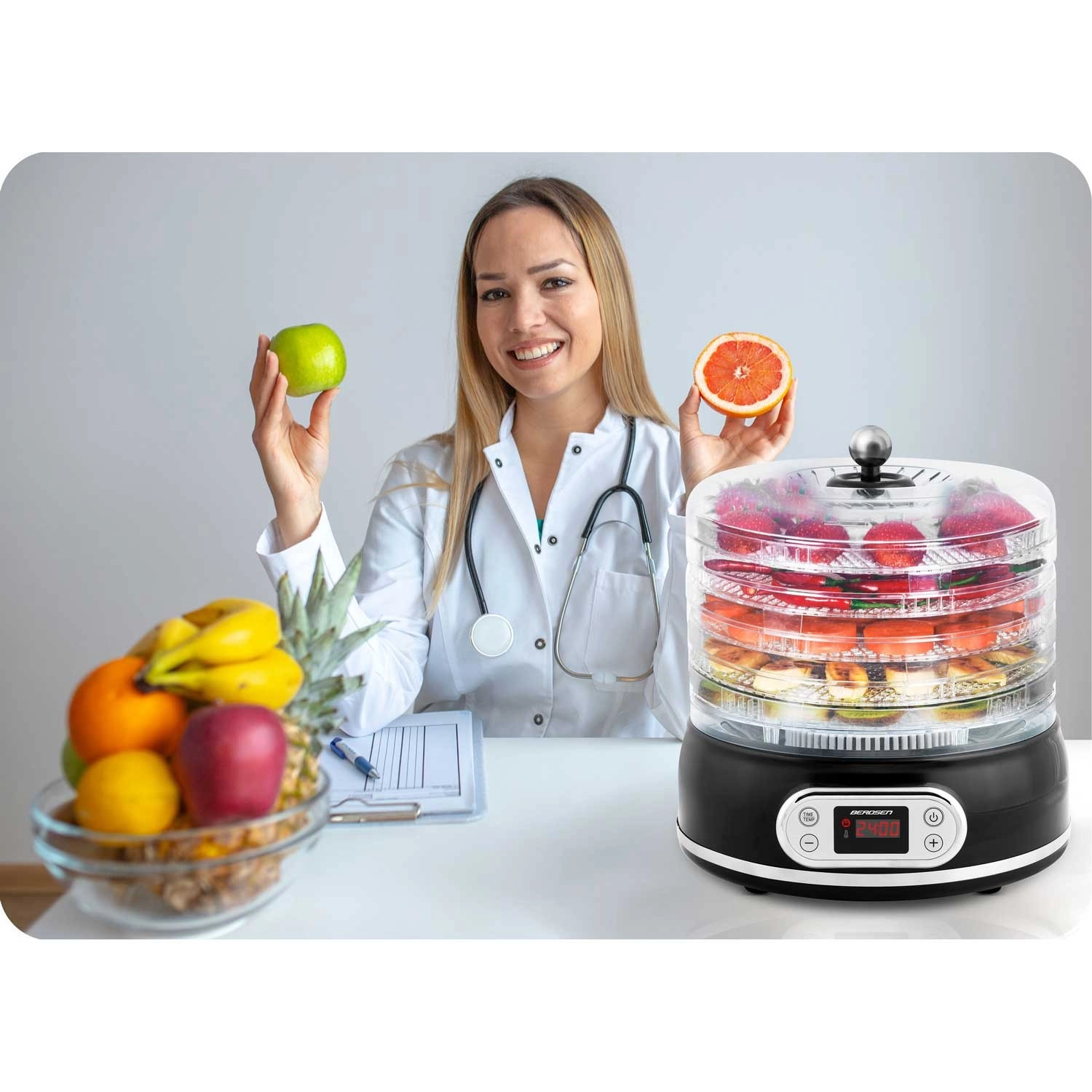 Lav sunde og velsmagende snacks – fra sprøde æbleringe og tørrede urter til hjemmelavet jerky. Berdsen-tørreren med elektronisk betjening og letlæseligt display sikrer præcis indstilling af tid og temperatur. Varmluftscirkulation giver ensartet gennemstrømning af varm luft, så skiverne tørres effektivt uden at blive overophedet.