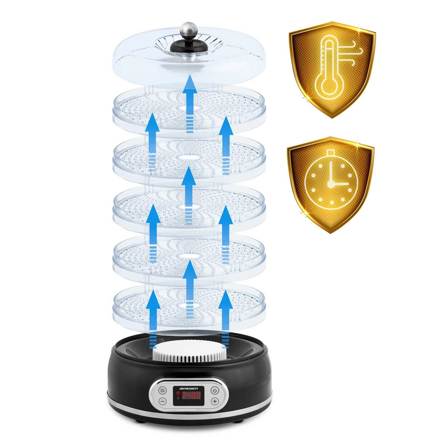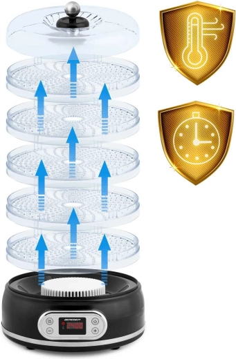 Den integrerede ventilator cirkulerer den varme luft på alle niveauer, så frugt, grøntsager og urter tørrer ensartet uden behov for hyppig omrokering.
