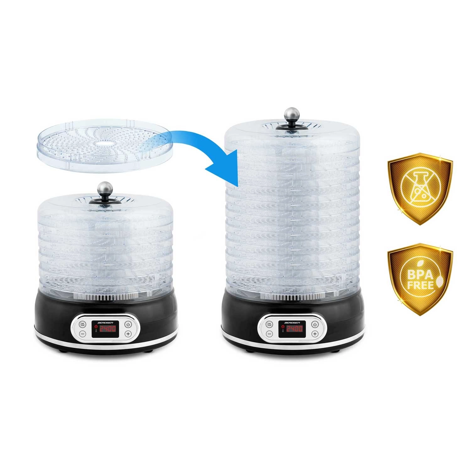 De praktiske 5 bakker med finmasket gitter forhindrer små stykker i at falde igennem. Den transparente udførelse gør det nemt at kontrollere tørringen, og takket være den non-stick overflade er vedligeholdelsen hurtig – bakkerne kan nemt skylles eller vaskes i opvaskemaskinen. De kompakte mål sparer plads, og den energibesparende effekt på 400 W reducerer omkostningerne.