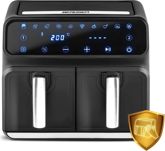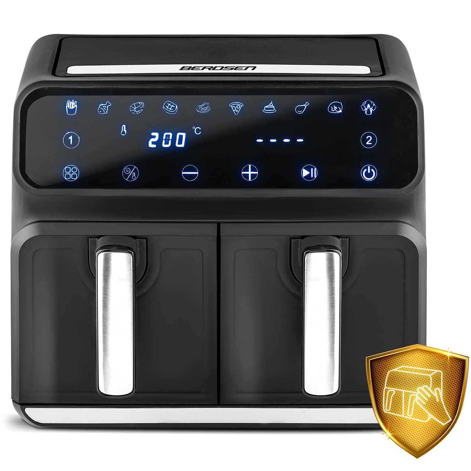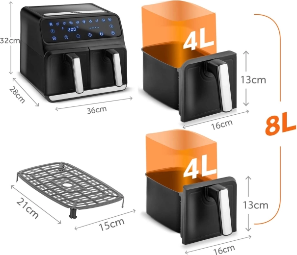 Intuitiv betjening sikres af et touchpanel med tydelige ikoner og 10 smarte programmer til pommes frites, fisk, rejer, bøffer, kylling, svinekød, kyllingeunderlår, pizza, kage og grøntsager. Temperaturen kan nemt indstilles op til 200 °C og tiden op til 60 minutter. Kurve og bageform med nonstick-PTFE-belægning kan gå i opvaskemaskinen – vedligeholdelsen klares på ingen tid.