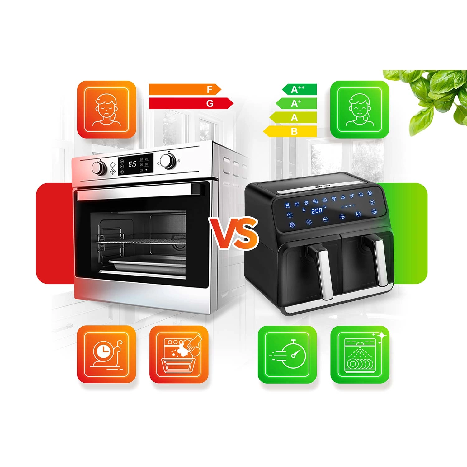 Lav mad sundere uden at gå på kompromis med smagen. Den varme luft cirkulerer jævnt og giver en sprød overflade og et saftigt indre – uden lugt af olie og unødigt svineri. To separate kurve gør det muligt at tilberede både hovedret og tilbehør samtidig og sparer dig tid og energi.