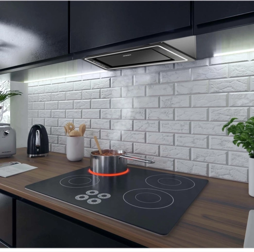 Den diskrete indbygningskonstruktion med sort glasfront passer perfekt til moderne og minimalistiske køkkener. Emhætten opfanger effektivt dampe og lugte, mens det 3-lags aluminiumsfedtfilter tilbageholder fedt og beskytter køkkenmøbler mod belægninger. LED-lyslisten på 5 W belyser desuden kogepladen optimalt for behagelig madlavning.