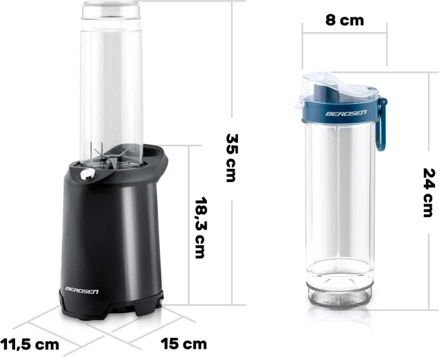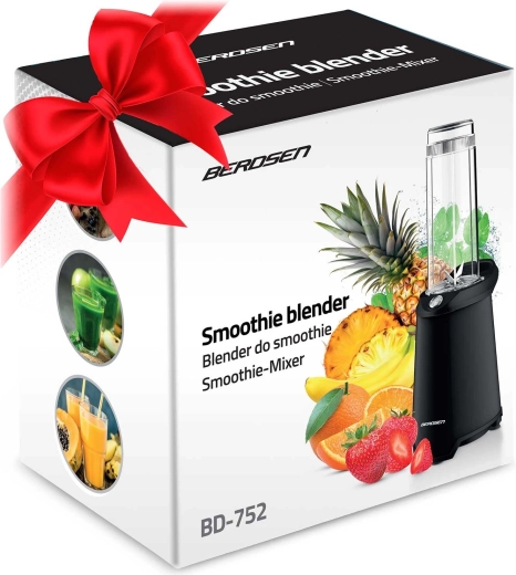 Den kompakte smoothieblender BERDSEN BD-752 er ideel til en aktiv livsstil. Takket være den kraftige motor på 700 W og skarpe rustfri stålknive klarer den nemt frugt, grøntsager og knusning af is. To to-go-flasker på 0,57 l med farvede låg og drypfri lukning kan du tage direkte med i bilen, på arbejde eller til træning. Enheden har skridsikre fødder, er nem at rengøre og opfylder strenge europæiske sikkerhedsstandarder.