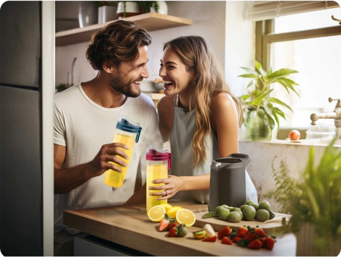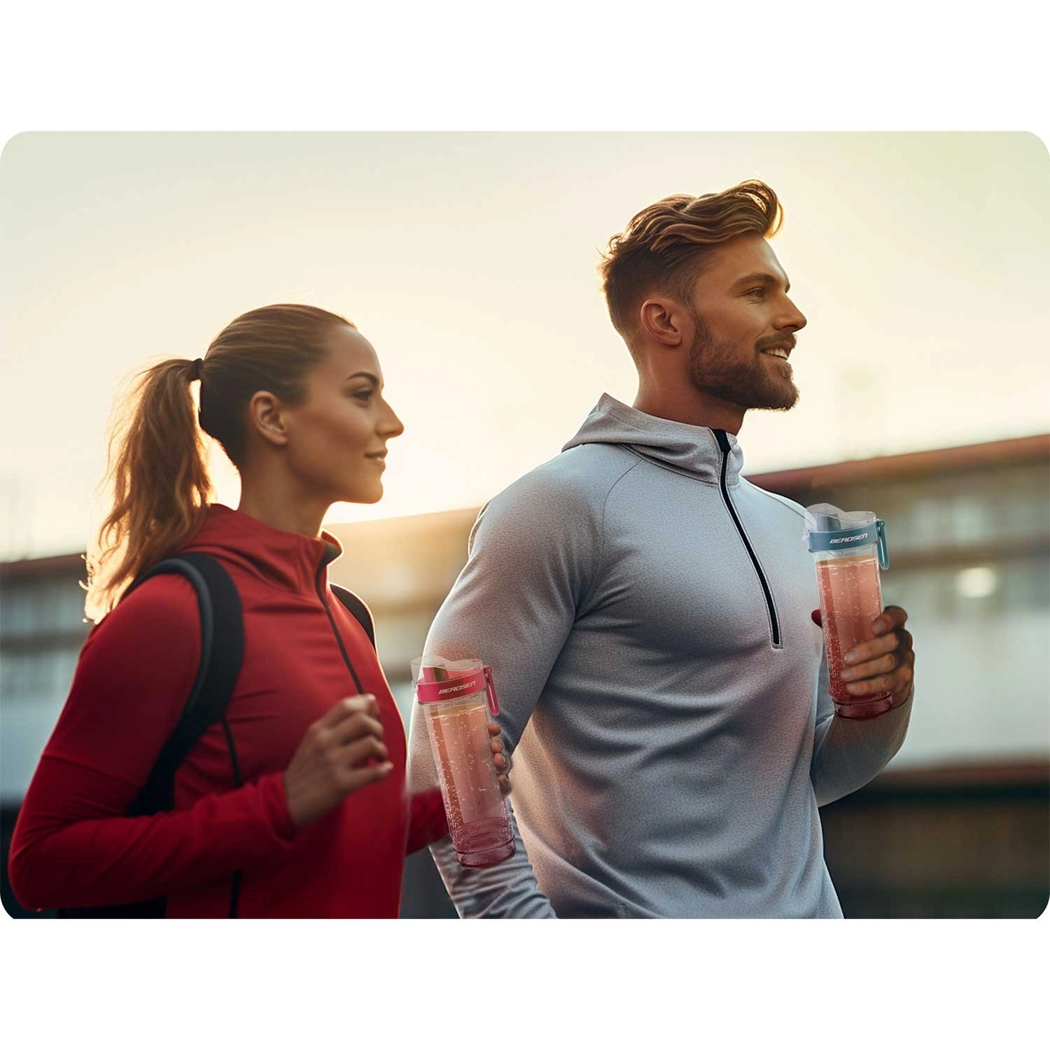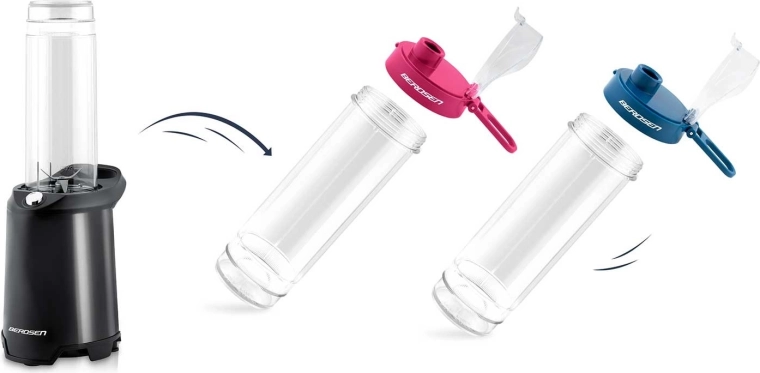 To bærbare flasker på 0,57 l med drypfrit låg og farvede kapsler. Du blender direkte i flasken og kan tage afsted med det samme.