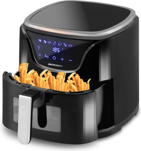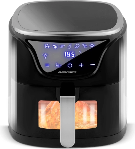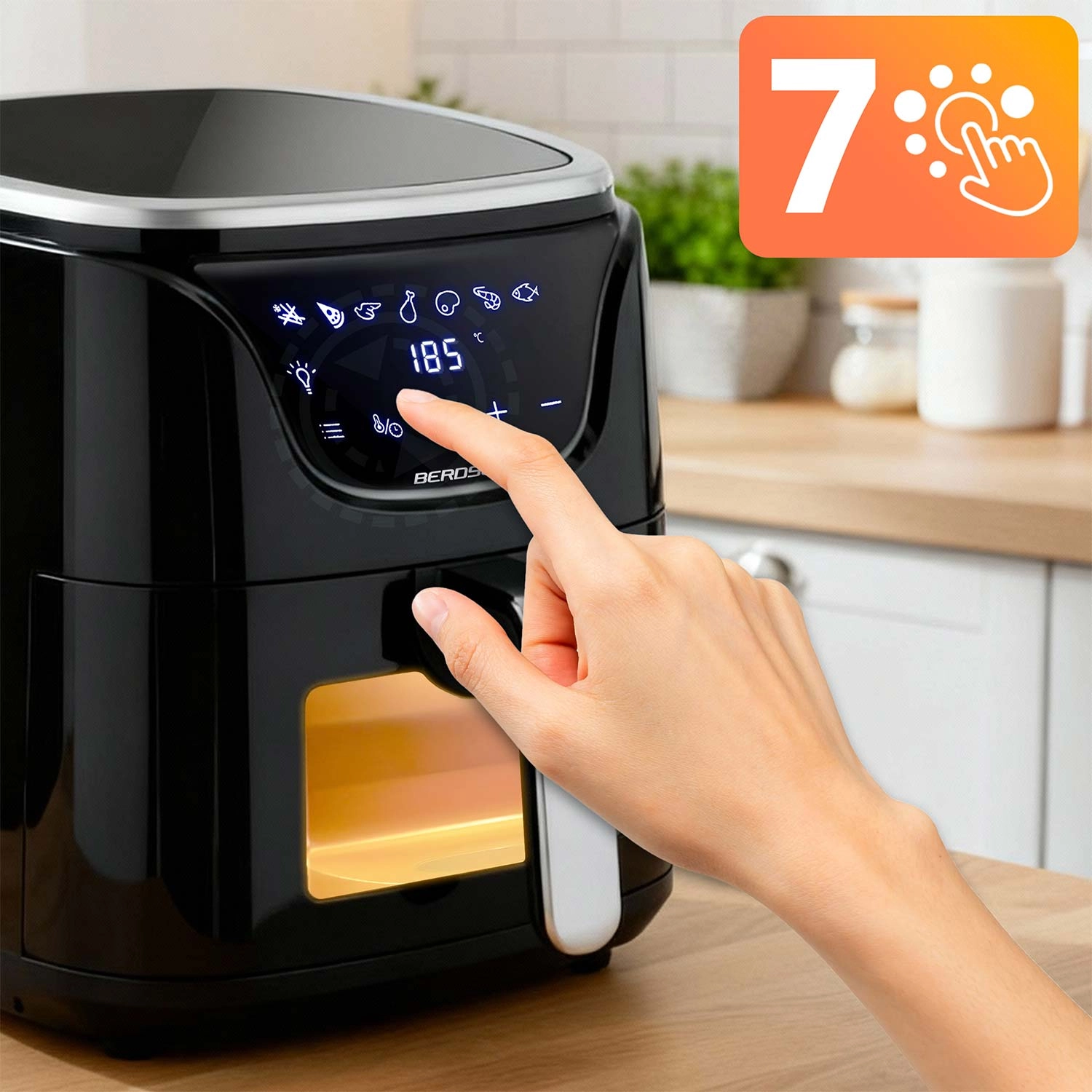 BERDSEN BD-652 varmluftsfrityre giver hurtig og velsmagende madlavning uden unødvendig olie. Det moderne touch‑panel med tydelige ikoner og et gennemsigtigt vindue gør, at du kan holde øje med maden uden at åbne kurven. Med en kapacitet på 5 l tilbereder du let aftensmad til familien, en stor portion pommes frites til vennerne eller bagte grøntsager til hele ugen.