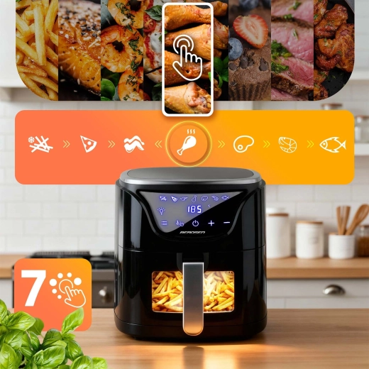 Oplev alsidigheden i køkkenet: udover varmluftsstegning bager, griller, opvarmer og tørrer frityren også frugt og grønt. 7 smarte programmer indstiller automatisk den ideelle tid og temperatur til pommes frites, pizza, vinger, drumsticks, steak, rejer og fisk. Der er temperaturregulering op til 200 °C, timer 0–60 min, praktisk LED‑belysning og en påmindelse om at vende maden.