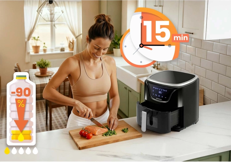 Nyd dine yndlingsretter med op til 90 % mindre fedt. Den hurtige cirkulation af varm luft giver en gylden, sprød overflade og et saftigt indre – uden lugt og uden svineri.