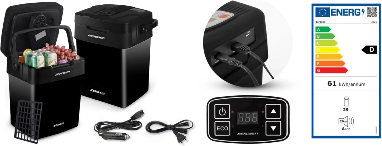 Den bærbare elektriske køleboks BERDSEN ICEMAX med et volumen på 29 liter er en pålidelig ledsager til rejser, camping og stranden. Takket være termoelektrisk teknologi kan den køle op til 18 °C under omgivelsestemperaturen og også opvarme op til +65 °C. To tilstande – ECO for lavere forbrug og Normal for hurtig ydelse – gør det muligt at tilpasse driften til aktuelle behov.