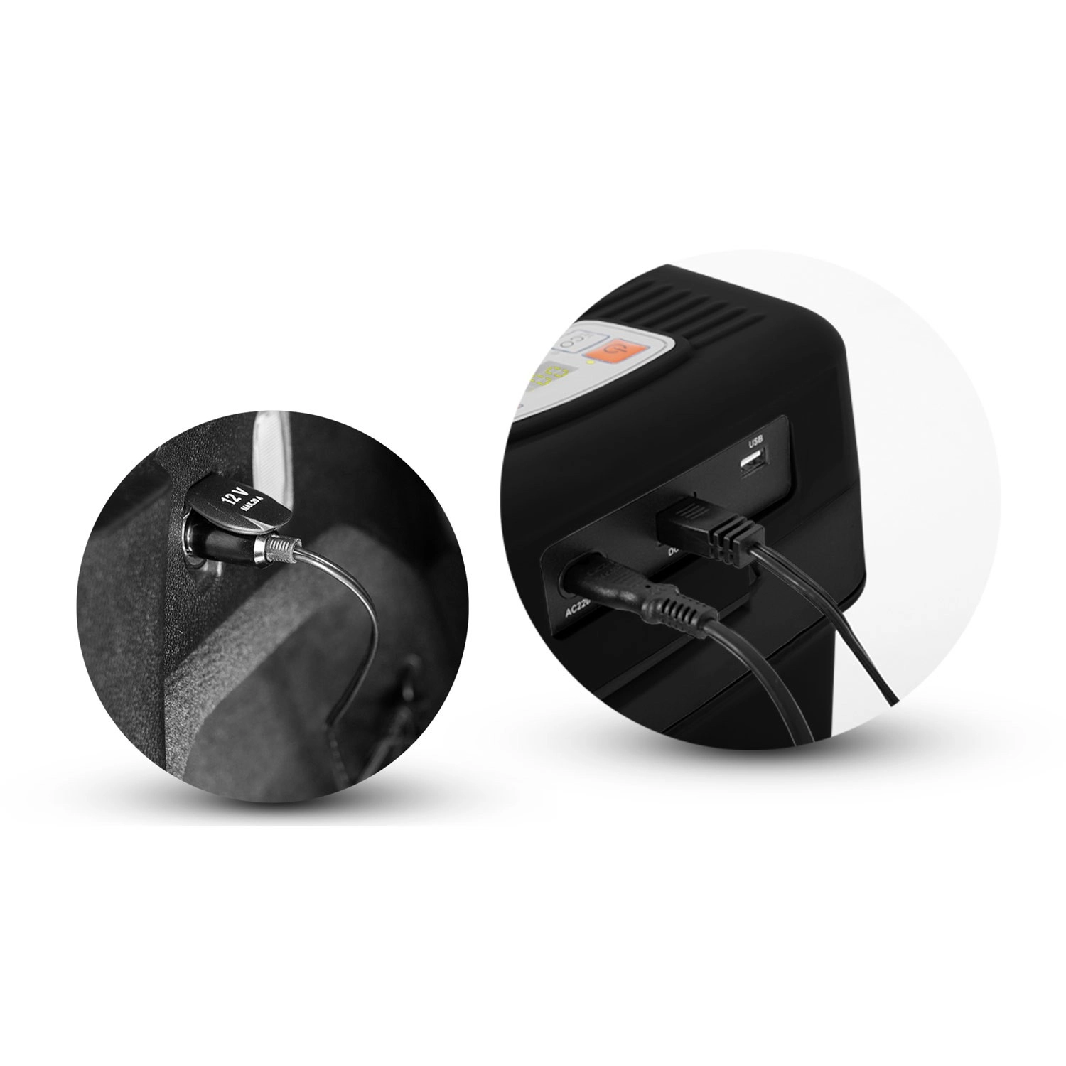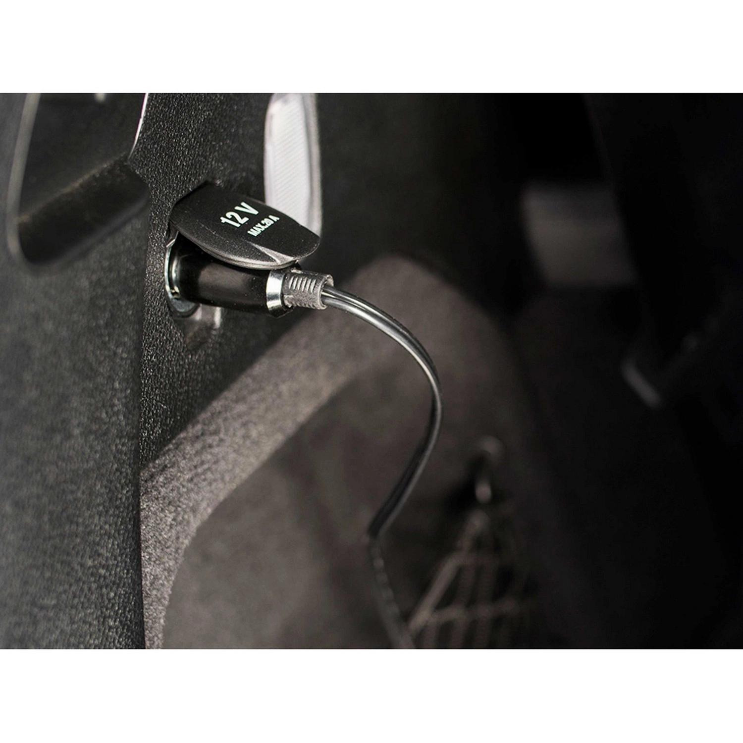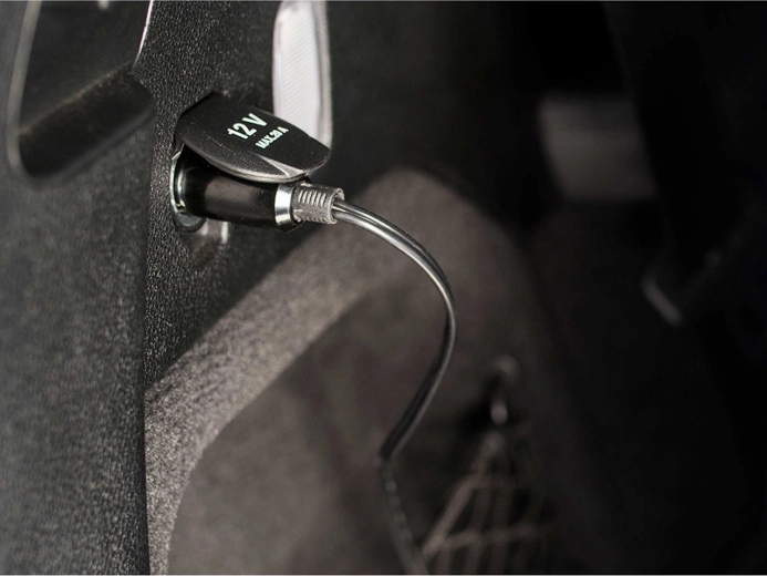 Tilslut i bilen via 12 V-udtaget eller derhjemme til 230 V. Den integrerede USB-port gør det muligt at oplade telefon eller navigation under kørslen.