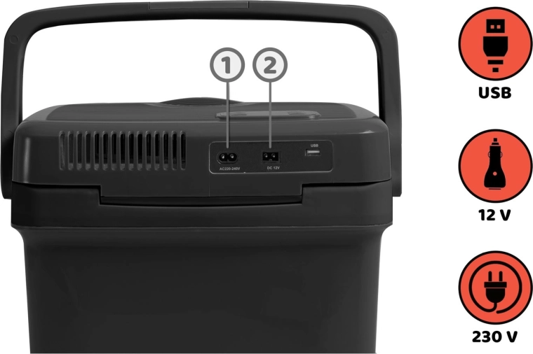 Betjeningen er enkel via det elektroniske panel med mulighed for temperaturindstilling. Strømforsyning 12 V i bilen og 230 V i hjemmet giver fleksibilitet, USB-port er praktisk til opladning af telefonen undervejs. Dobbelt isolering, lågpakning og indbygget ventilator opretholder et stabilt klima indeni. Klapbart bærehåndtag fungerer også som lås til låget, og aftagelig opdelingsrist gør det nemt at organisere mad og drikke.