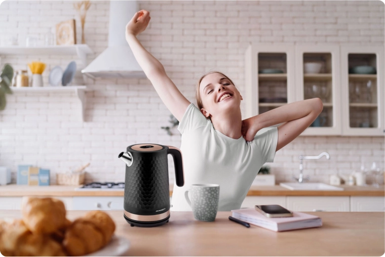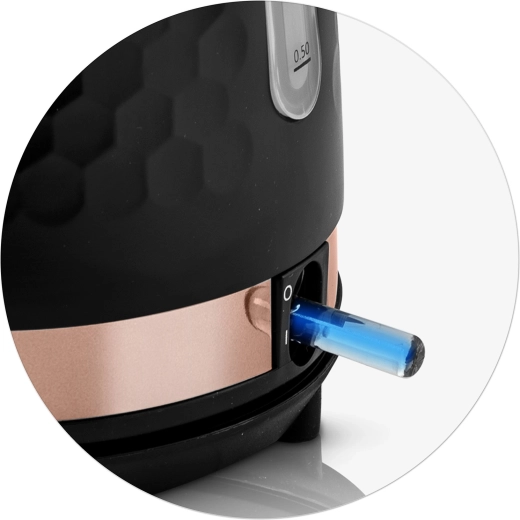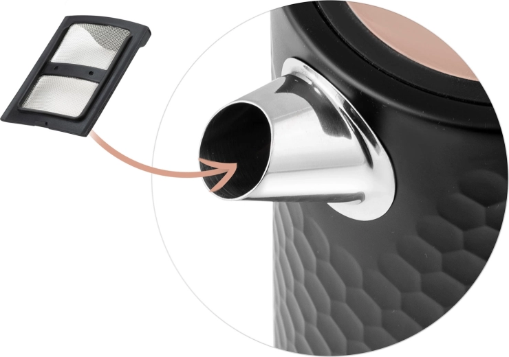 Praktiske detaljer som 360° drejbar base til både højre- og venstrehåndede, oplyst tænd/sluk-knap og vandstandsmåler giver intuitiv betjening. Et aftageligt metalfilter fanger kalk, så du kan nyde den rene smag af te og kaffe. Beskyttelse mod tørkogning og stabile skridsikre fødder øger sikkerheden.